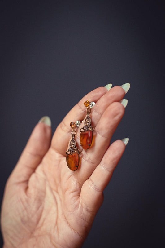 Amber Glass Half Moon Crystal and Ornate Stamped Brass Earring - Vintage Estate Jewelry