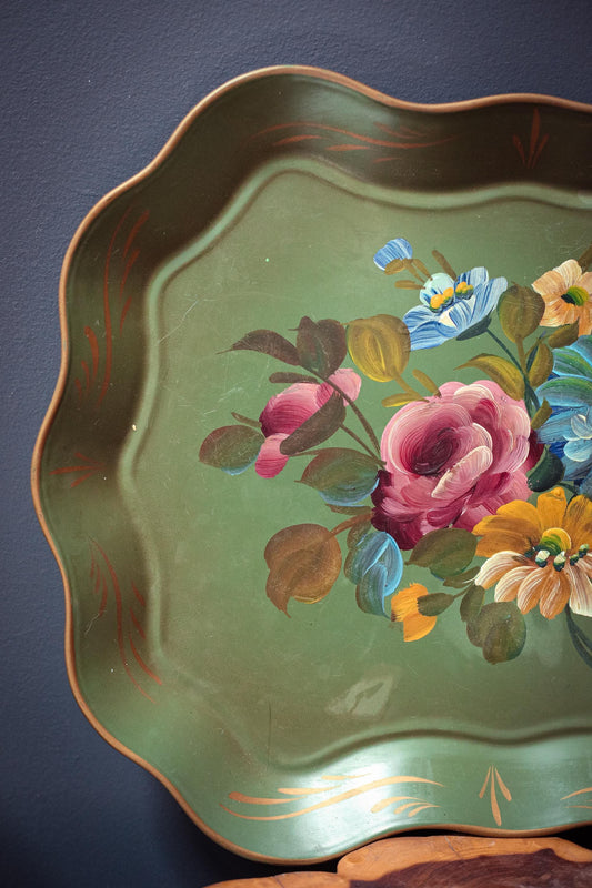 Large Green Floral Tole Painted Metal Tray - Vintage Floral Toleware Sage Green & Gold