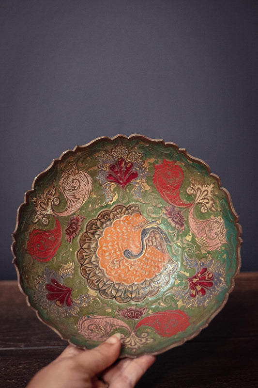 Large Green Brass Enamel Peacock Bowl 7.5" Wide - Vintage Brass Enamel Altar Bowl