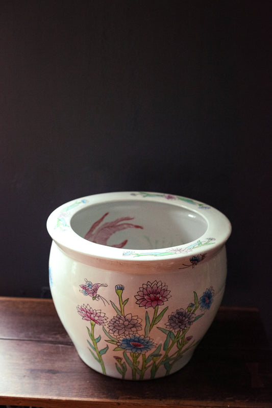 Large Hand Painted Porcelain Jardiniere - Vintage Chinese Koi Floral Pastel Painted Indoor Planter