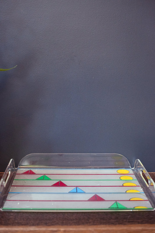 Lucite Midcentury Modern Sailboat and Sunrise Tray - Modern Minimal Frosted Acrylic Lucite Clear Multicolor Serving Tray