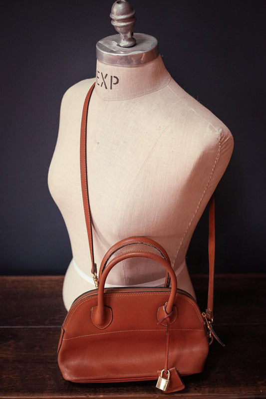 Made in France Caramel Brown Saffiano Leather Crossbody Bag with Short Handles & Brass Hardware - Vintage Focus Paris Purse