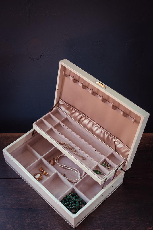 Mele Two Tier Leatherette Jewelry Case - Vintage Made in USA Satin and Velvet Lined Jewelry Box