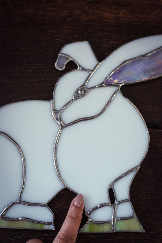 Stained Glass White Rabbit - Vintage Large Stained Glass Bunny Art Piece