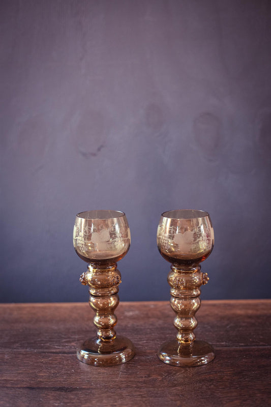 German Hand Blown Etched Bubble Stem Wine Glasses - Antique Roemer Olive/Amber Wine Glasses Fritz Heckert *See condition notes