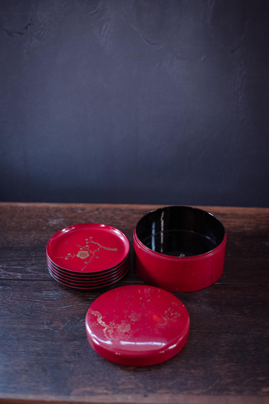 Red/Gold Plastic Coaster Set with Box - Vintage Chinoserie Coasters *As Is see description for Condition Notes