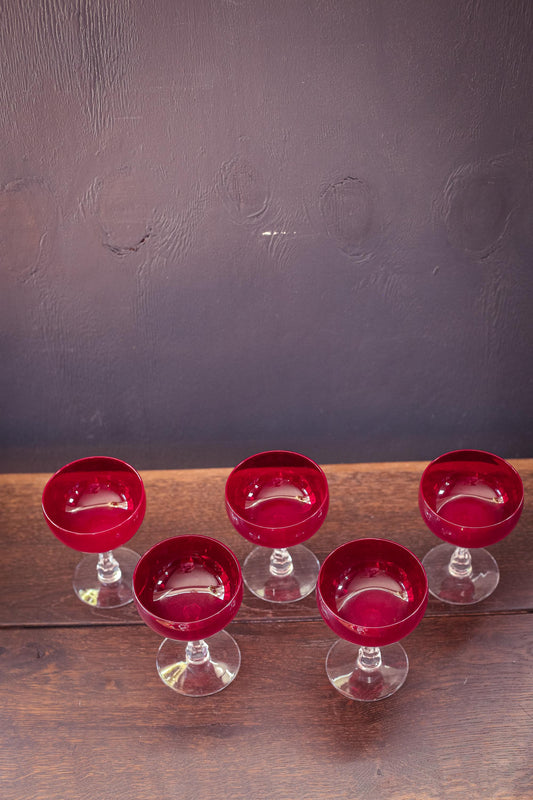 Set of 5 Fostoria Fascination Ruby Champagne/Sherbet Glasses - Vintage Red and Clear Glassware Stemware