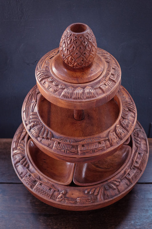Carved Teak Server with 3 levels - Vintage Wood Serving Stand