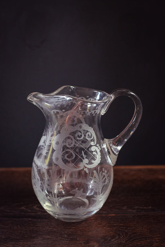 Etched Glass Pitcher with Reindeer - Vintage Cut Glass Crystal Water Pitcher
