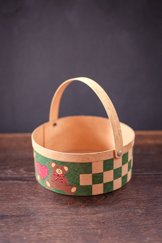 Green Red Wood Holiday Basket with Bears - Vintage Wooden Holiday Basket