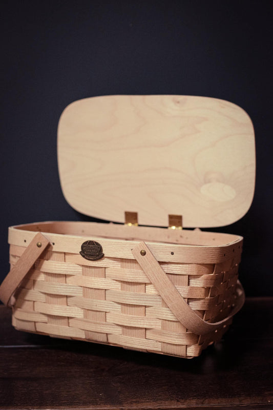 Vintage Peterboro Basket Co Picnic Basket with Wood Top & Swing Handles - Vintage White Ash Picnic Basket for Two with Hinged Lid