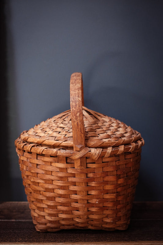 Extra Large Square to Round Shaker Style Lidded Basket with Bent Wood Handle & Lid - Antique Woven Wood Splint Basket with Lid