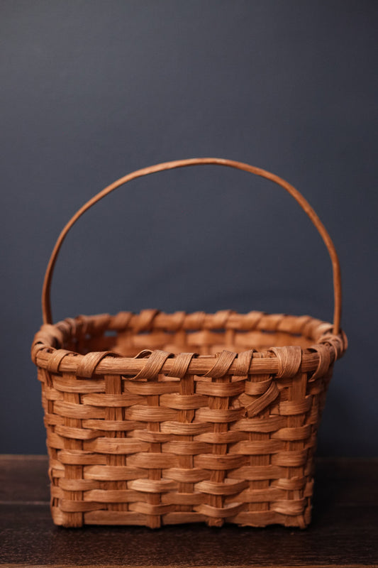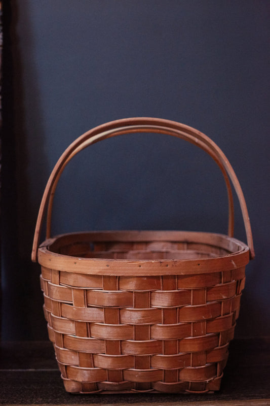 Square to Rounded Rectangle Flat Bottom Splint Wood Basket with Bent Wood Handle - Vintage Farmhouse Knitting/Gathering Basket