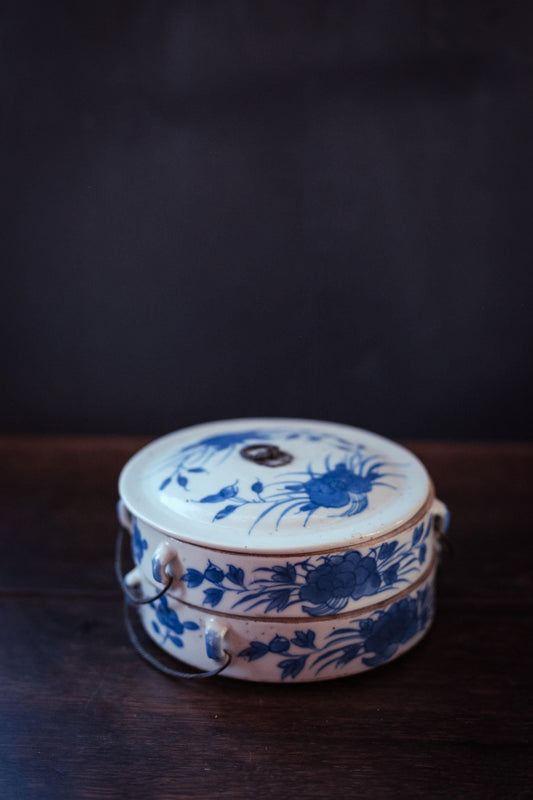 Two Tier Lidded Hand Painted Blue White Ceramic Trinket Dish - Vintage Porcelain Stacked Ceramic Storage Dish
