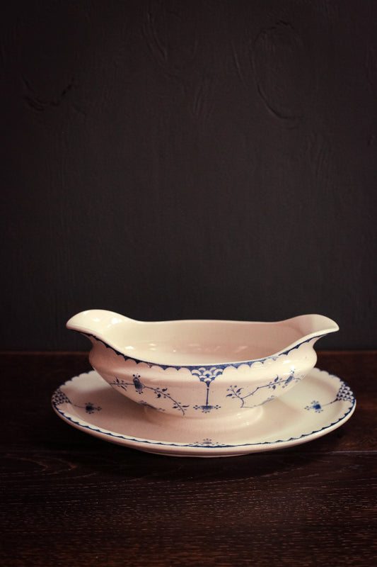 Blue Fluted Gravy Bowl with Attached Plate Furnival - Antique Blue White Ceramic Dishware
