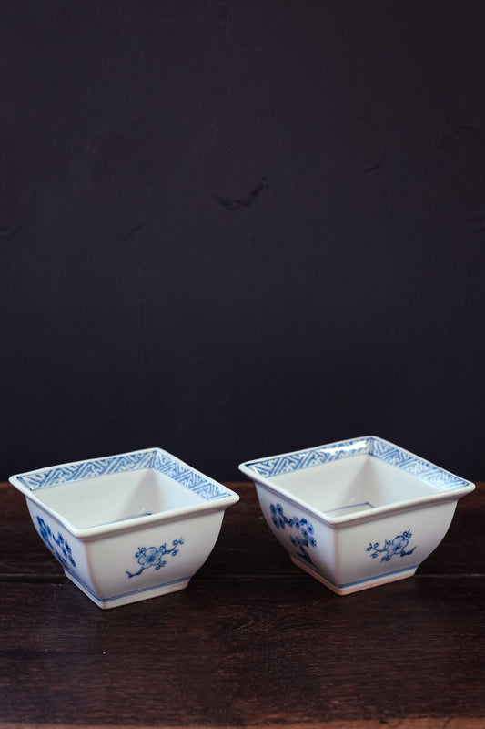 Blue White Hand Painted Square Porcelain Bowls - Vintage Japanese Porcelain Rice/Soup Bowls
