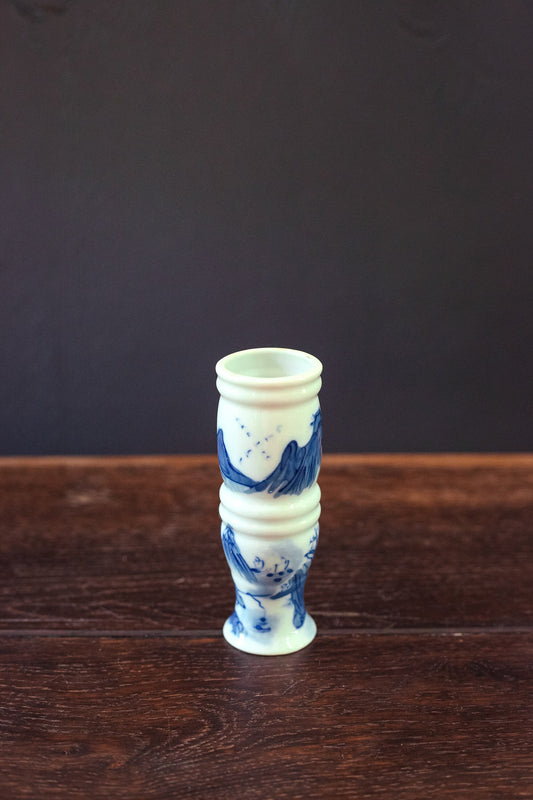 Small Hand Painted Scenic Cylinder Vase - Vintage Mountain Scene Blue & White Japanese Bud Vase
