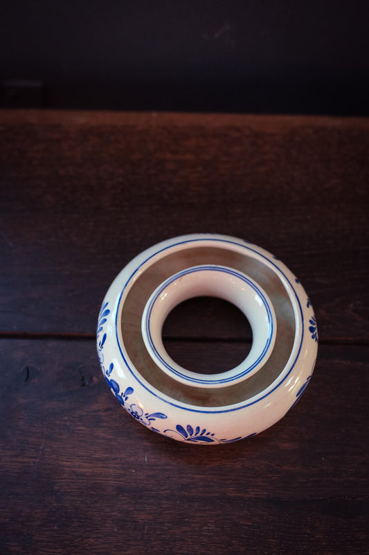 Round Delft Blue and White Handpainted Flower Frog Vase - Vintage Delft Blue Floral Donut Vase