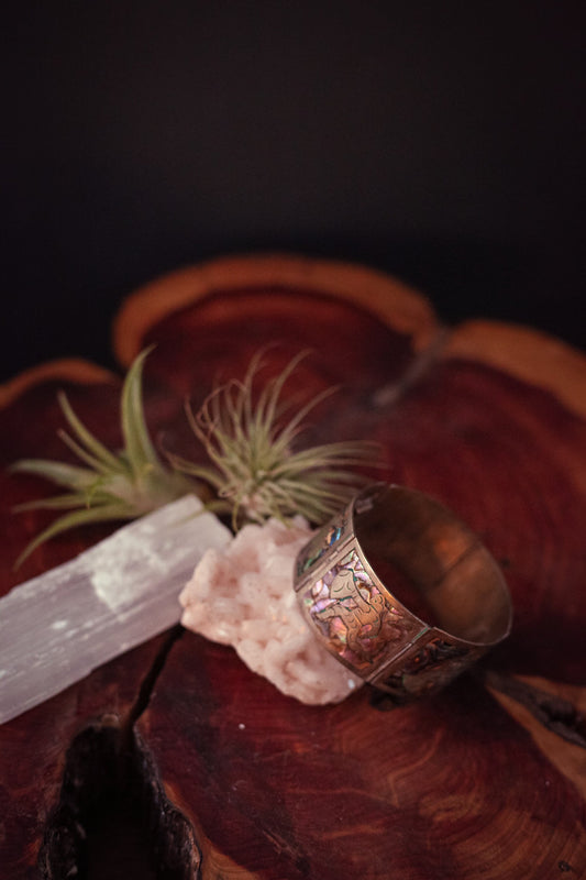 Mexican Abalone Silver Bracelet - Vintage Mexcan Cuff Bracelet with Farm Cattle Design
