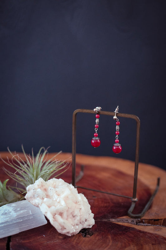Carnelian and Silver Bead Earrings - Vintage Estate Red Jade Earrings