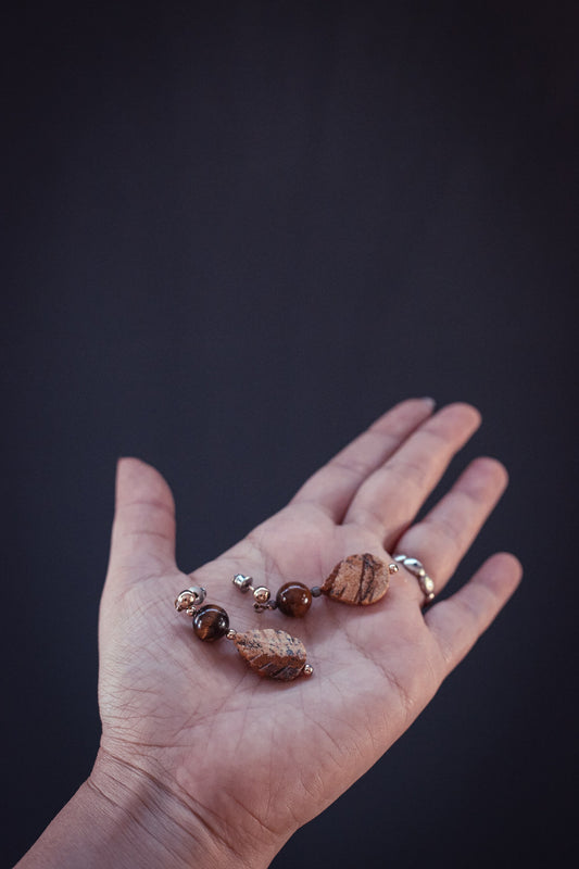 Tigers eye and Carved Picture Jasper Drop earrings w/ gold post bar - Vintage Estate Jewelry Carved Leaf Jasper & Tiger's Eye Earrings
