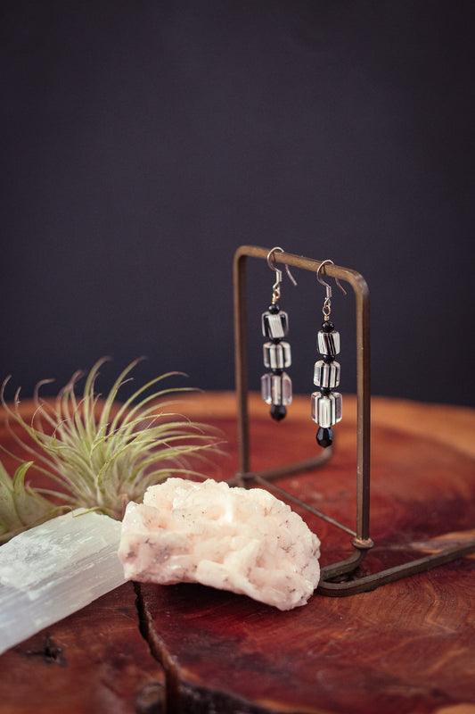 Hand Rolled/Cut Glass Bead Crystal Earrings in Black White Clear - Vintage Glass & Crystal Earrings