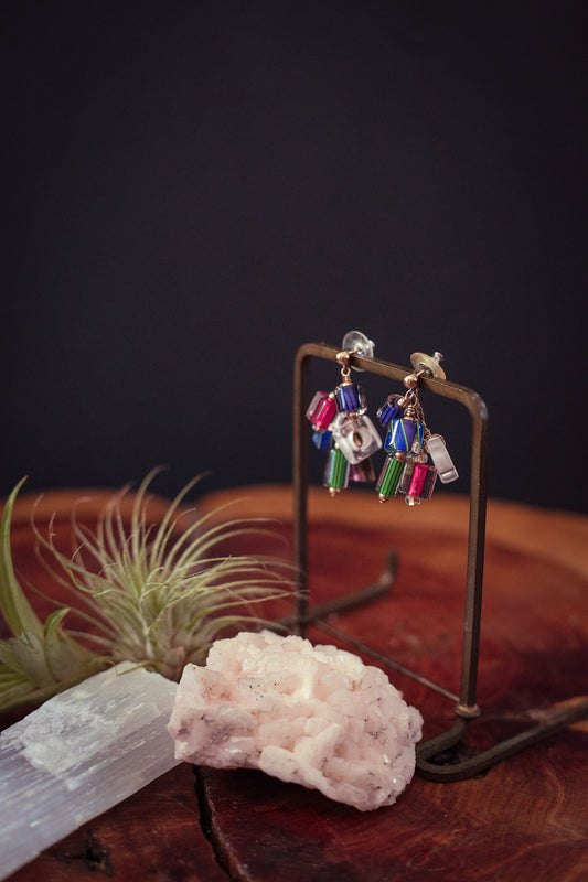 Colorful Hand Rolled Cut Glass Beads with 14K Gold Filled Ball Post Back - Vintage Studio Glass Cluster Earrings