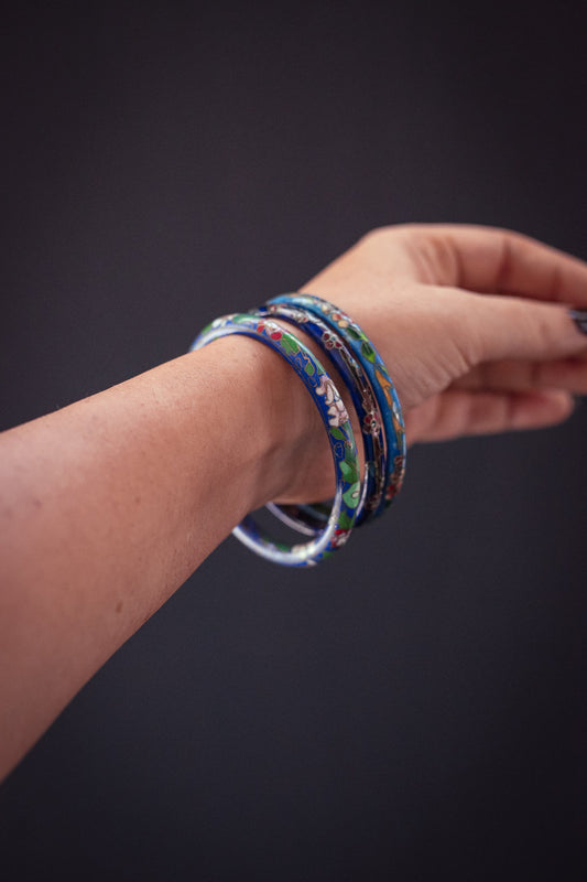 Set of 3 Blue Brass Enamel Cloisonné Bracelets - Vintage Colorful Chinese Bangles