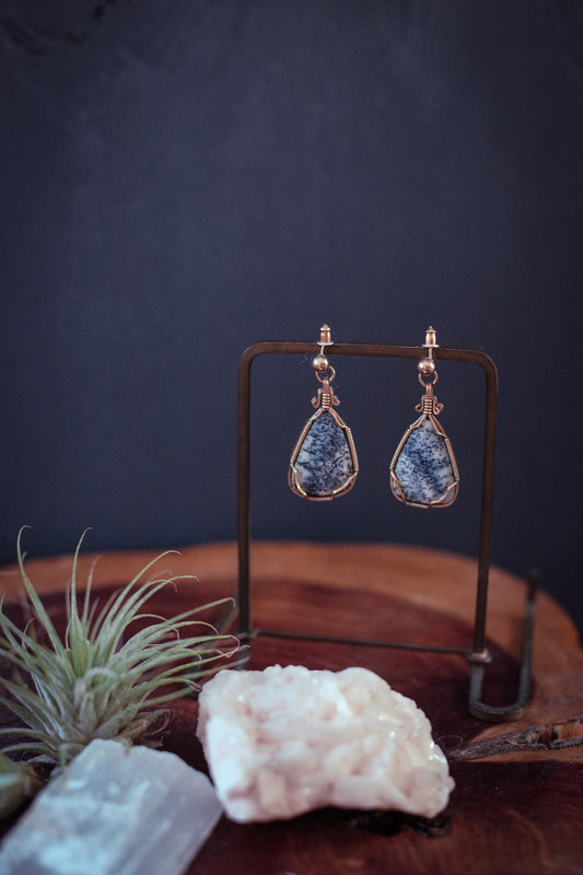 Intricate Gold Wire Weave Dendritic Opal 14K GF Ball Post - Vintage Estate Wire Wrapped Dendritic Agate Earrings