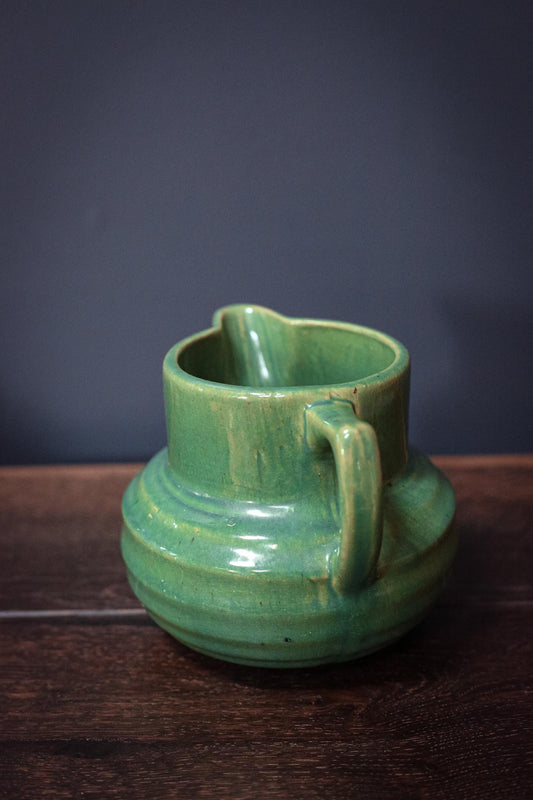 Green Stoneware Pitcher with Ridges, Angular Spout & Handle - Vintage McCoy Stamped Handmade Ceramic Glazed Pottery Farmhouse Kitchen