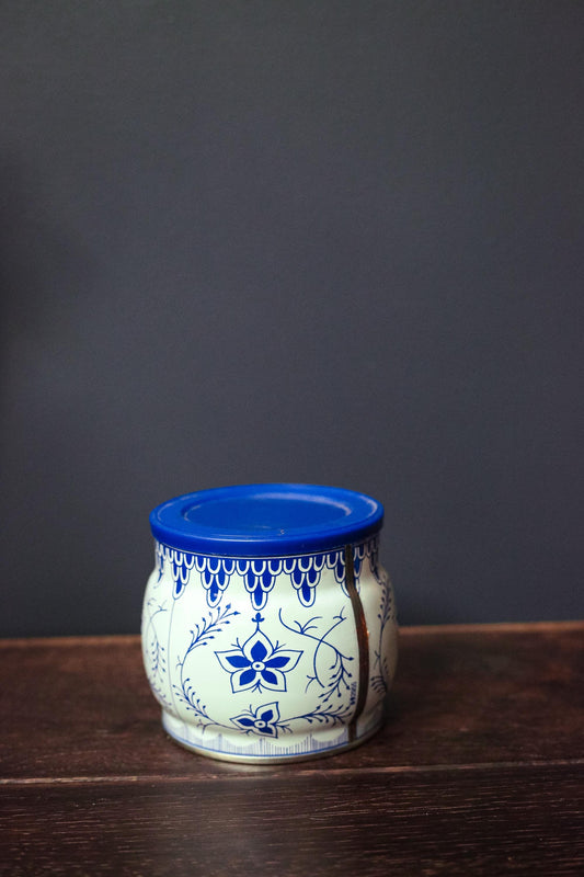 Small Blue Strawflower Metal Tin - Vintage Blue and White Tin