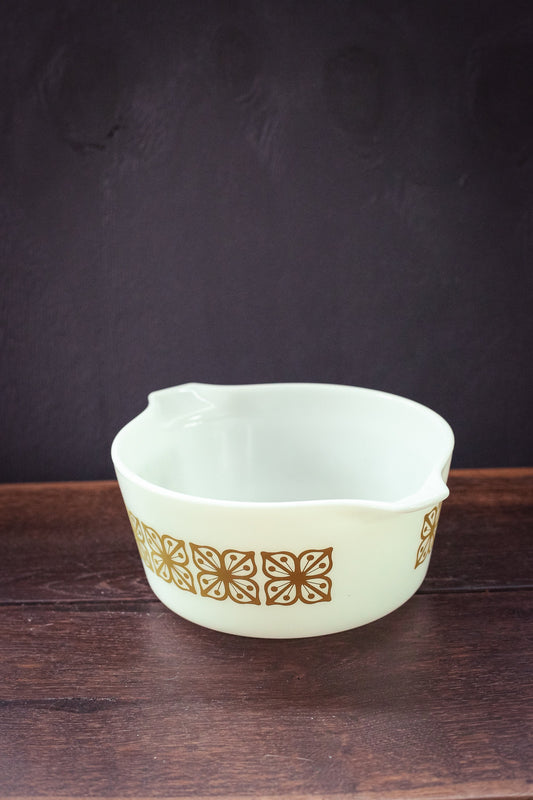 Vintage Pyrex Verde Square 1.5 QT Round Baking Dish with Handles - 1960's White Square Flowers Geometric Floral Pyrex