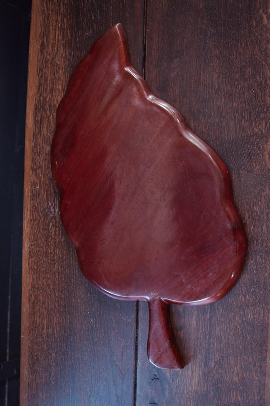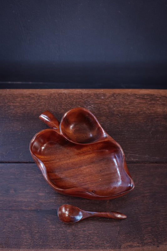 Monkeypod Carved Wooden Leaf Bowl and Ladle - Vintage Hawaiian Monkeypod Serving Tray and Spoon
