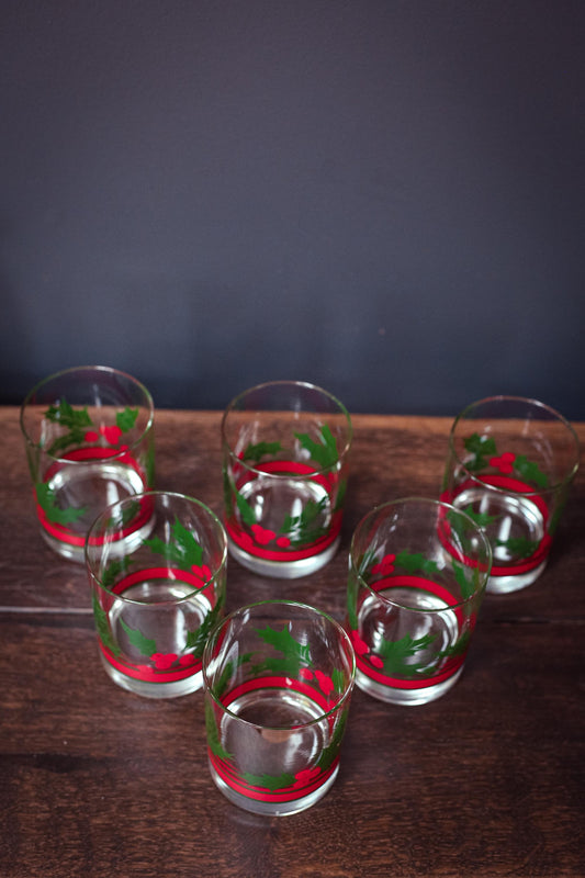 Set of 6 Libbey Holly & Berries Printed Double Old Fashioned Tumblers - Vintage Midcentury Modern Glassware