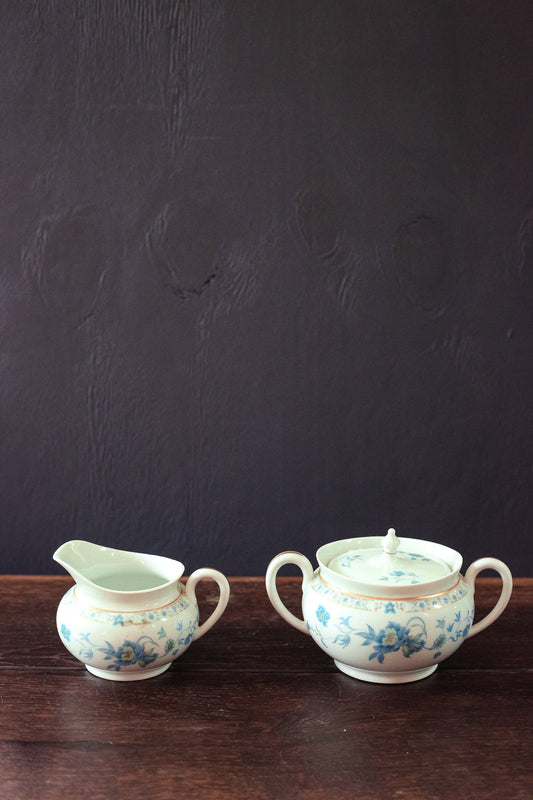 Nankin Cream & Sugar Set with Blue White Gold Floral Design - Antique Haviland Limoges Porcelain Cream and Sugar