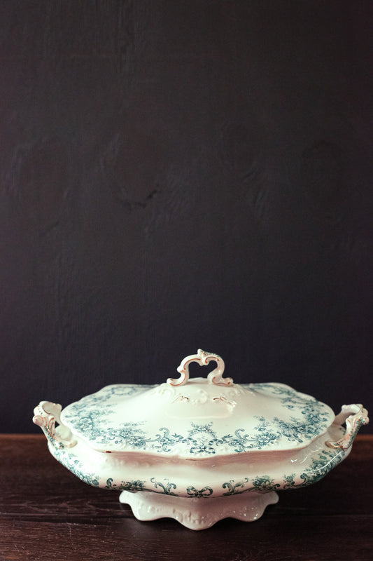 Antique Ironstone Transferprint Soup Toureen with Lid in Green Gold on Ivory - 19th Century WTH Smith Co Longport England Dewey
