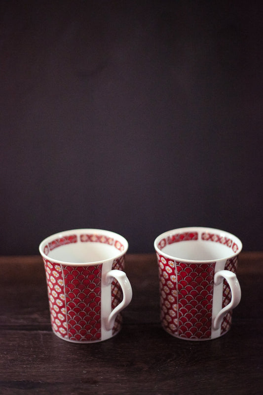 Pair of Vintage Orange Print Porcelain Mugs - Mixed Pattern Printed Mug Set