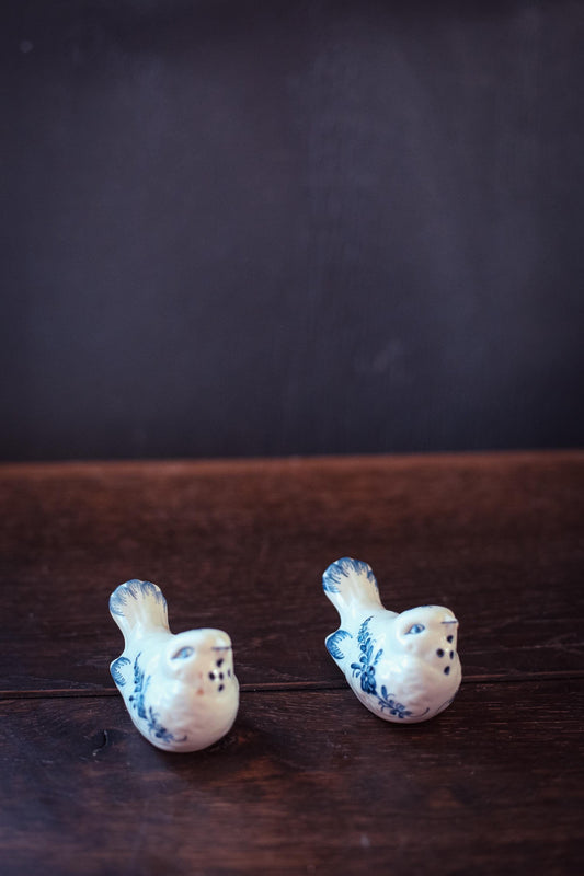 Pair of Limoges Blue and White Porcelain Bird Salt/Pepper Shakers - Chantilly Hand Painted Blue Floral Bird Shakers