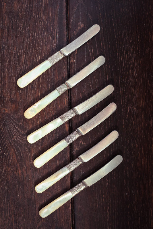 Set of 6 Small Silver Mother of Pearl Butter Knives - Vintage MOP silver handle Knife Set
