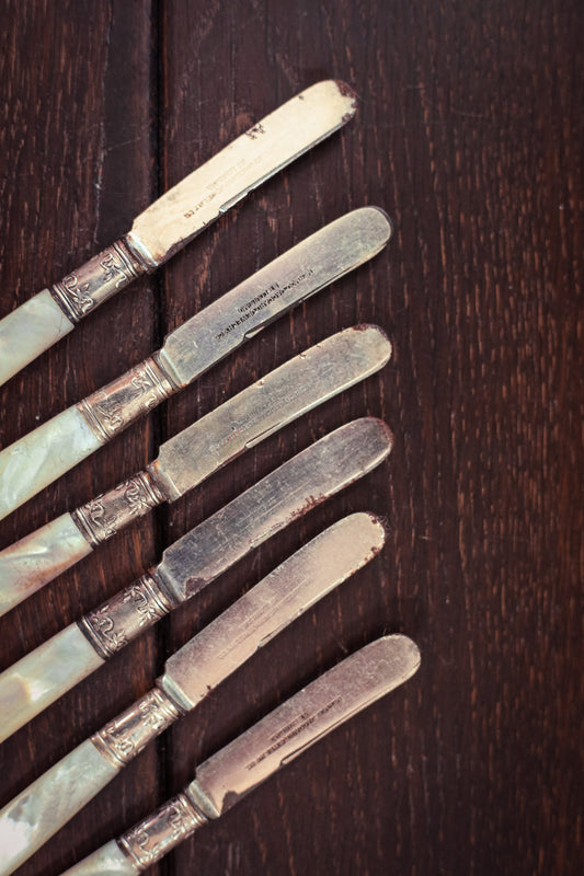 Set of 6 Small Mother of Pearl Handle Butter Knives - Vintage MOP Silver Fruit Knife Set *As Is see description*