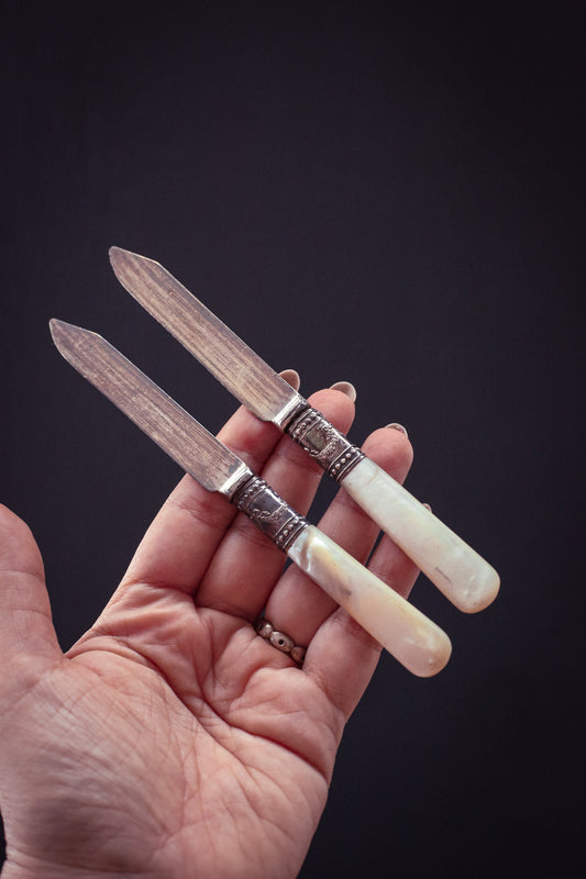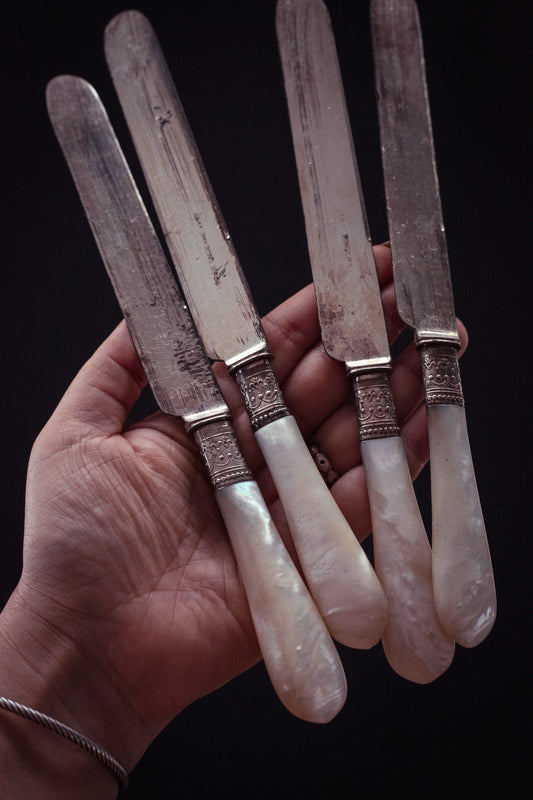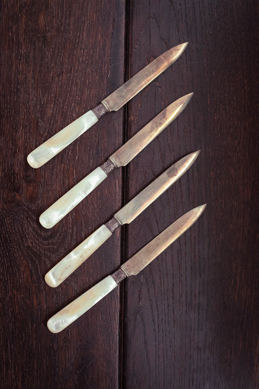 Mother of Pearl & Silver Knives set of 4 - Vintage MOP Handle Silver Ferrule Knives