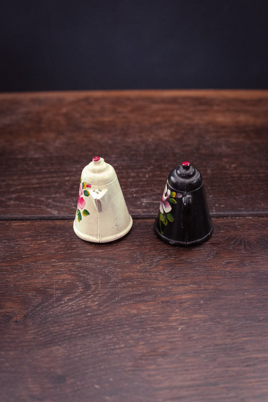 Pair of Black/White Floral Painted Metal Salt & Pepper