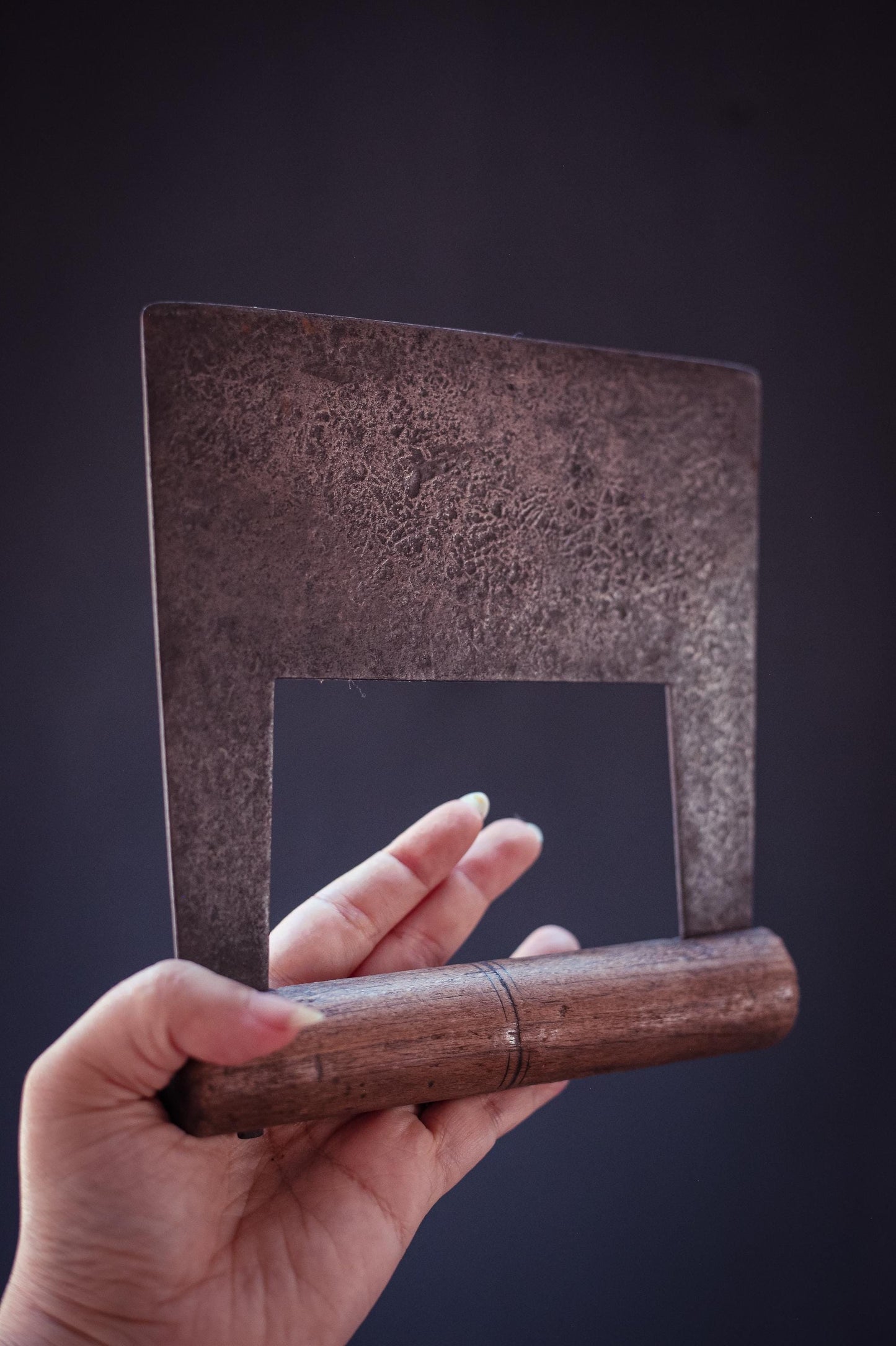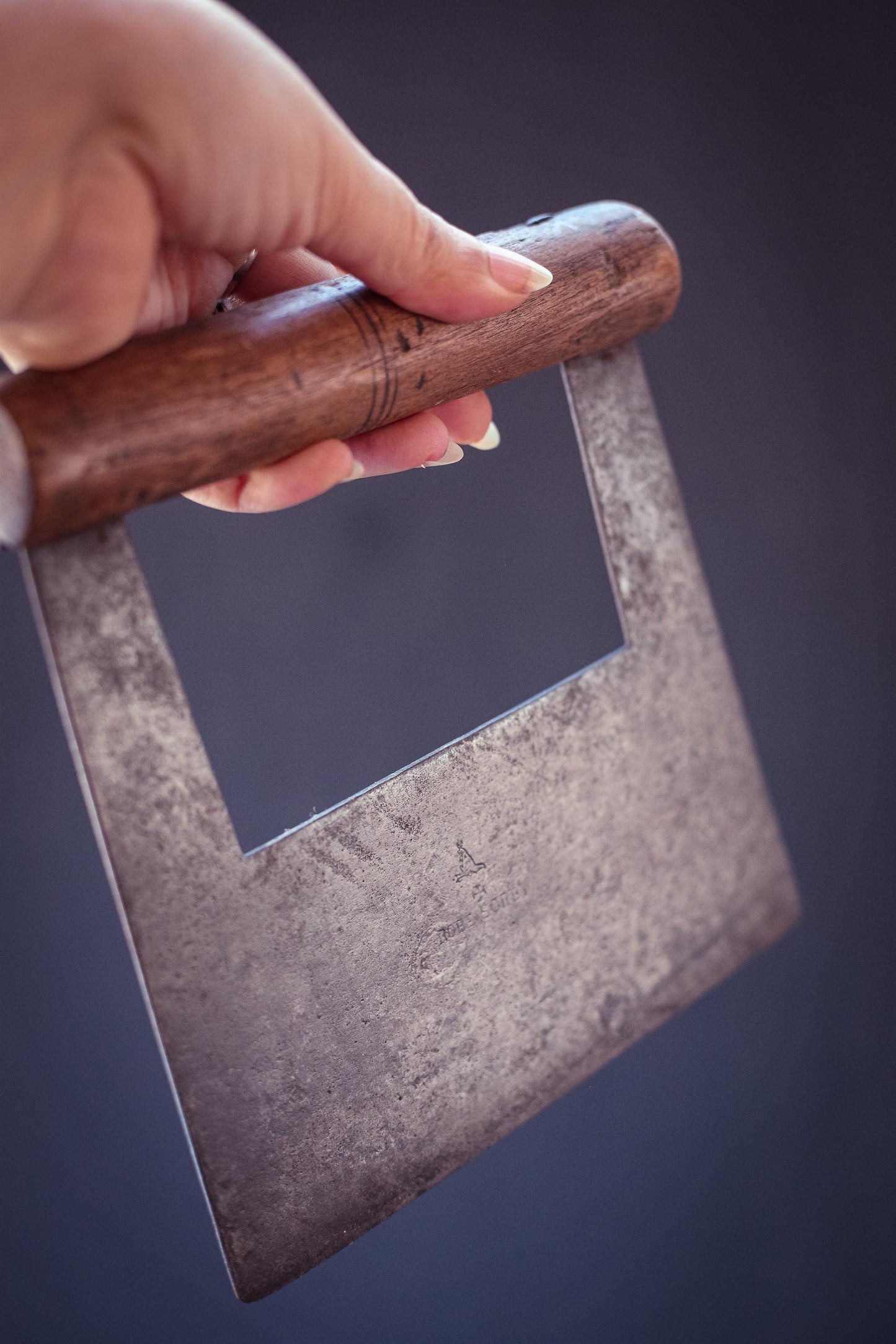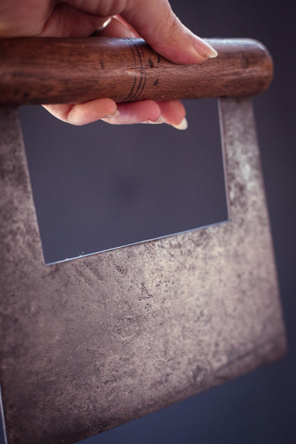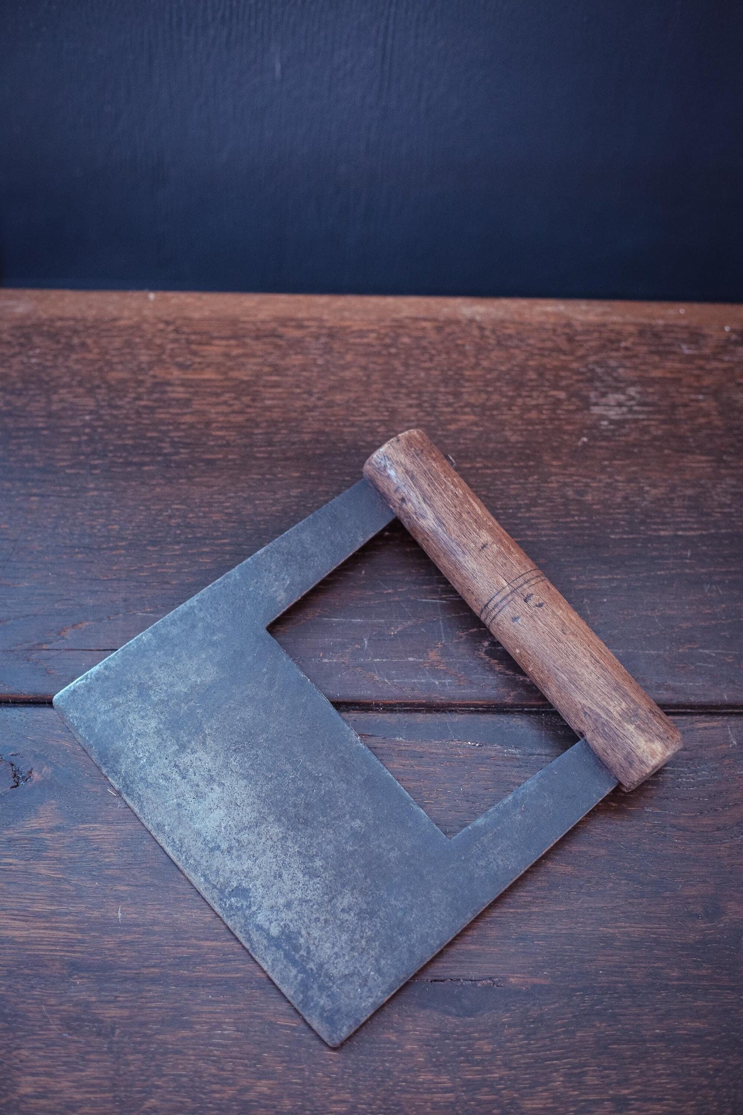 Unique metal and wood blade with flat front edge. Not curved like herb/mezzaluna but flat like a dough blade. Maker mark is Robert Sorby England on one side of the blade.