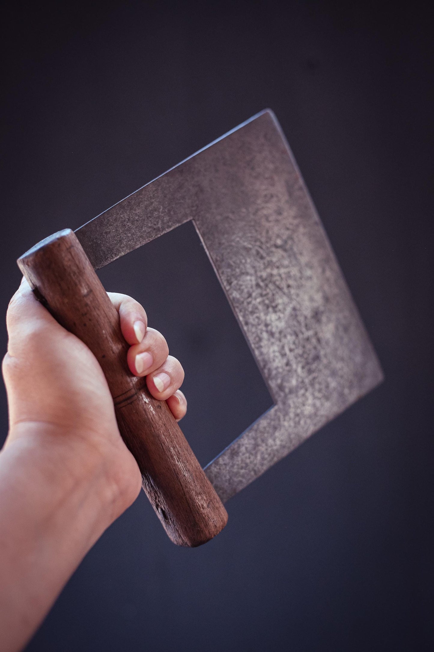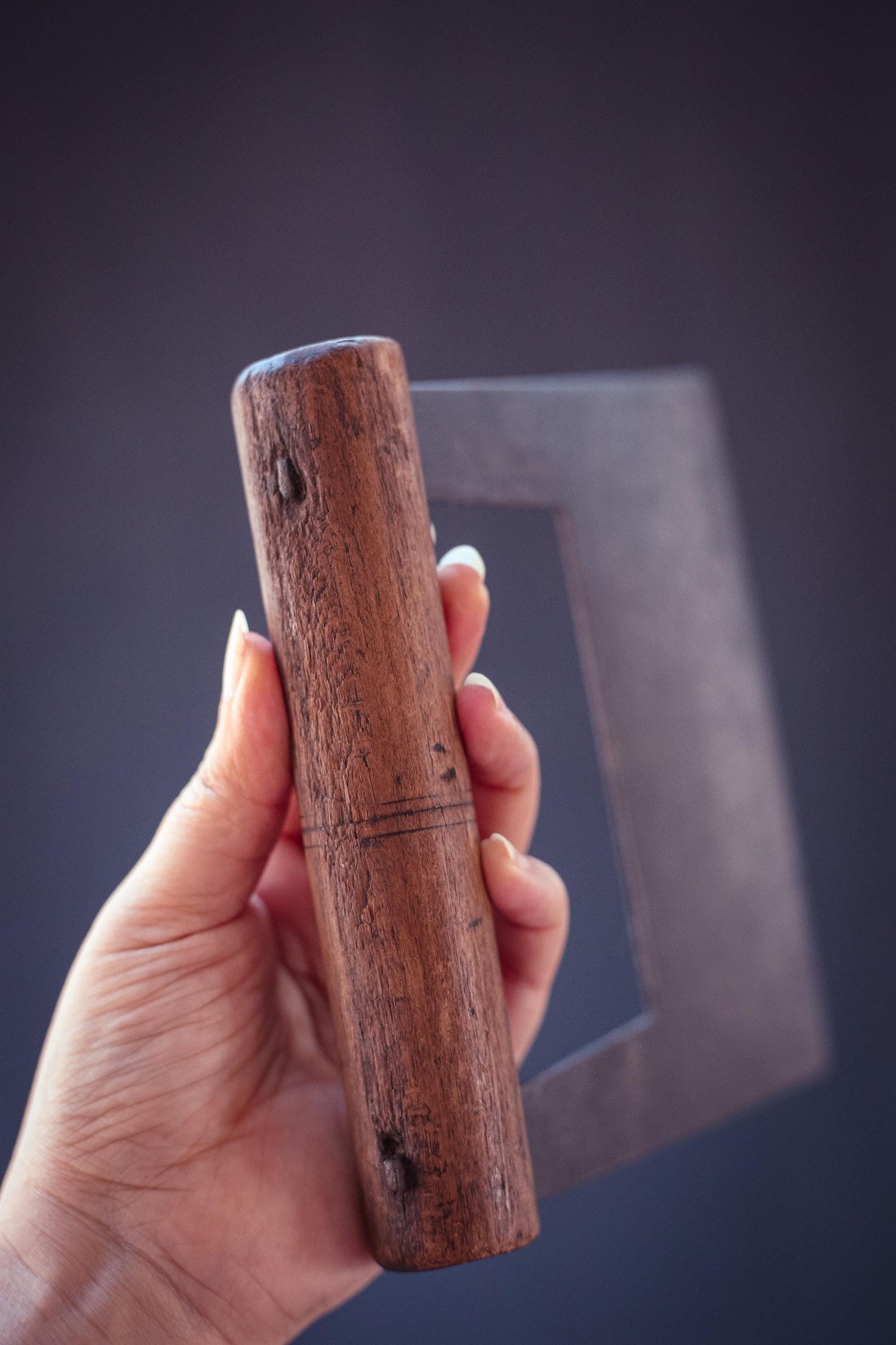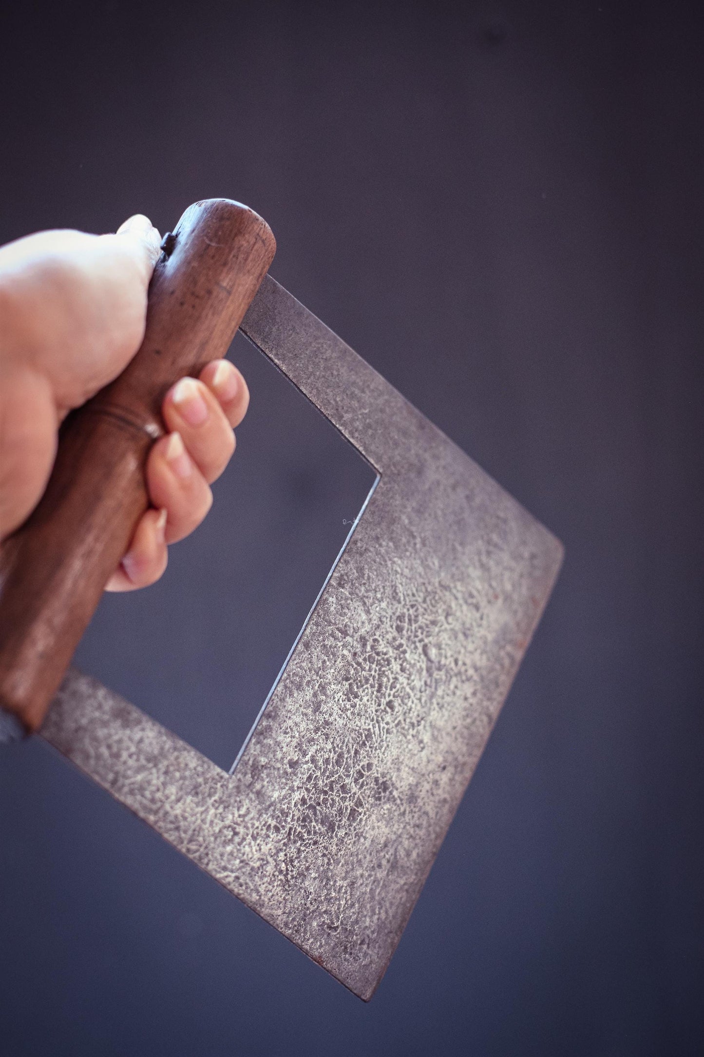 Unique metal and wood blade with flat front edge. Not curved like herb/mezzaluna but flat like a dough blade. Maker mark is Robert Sorby England on one side of the blade.