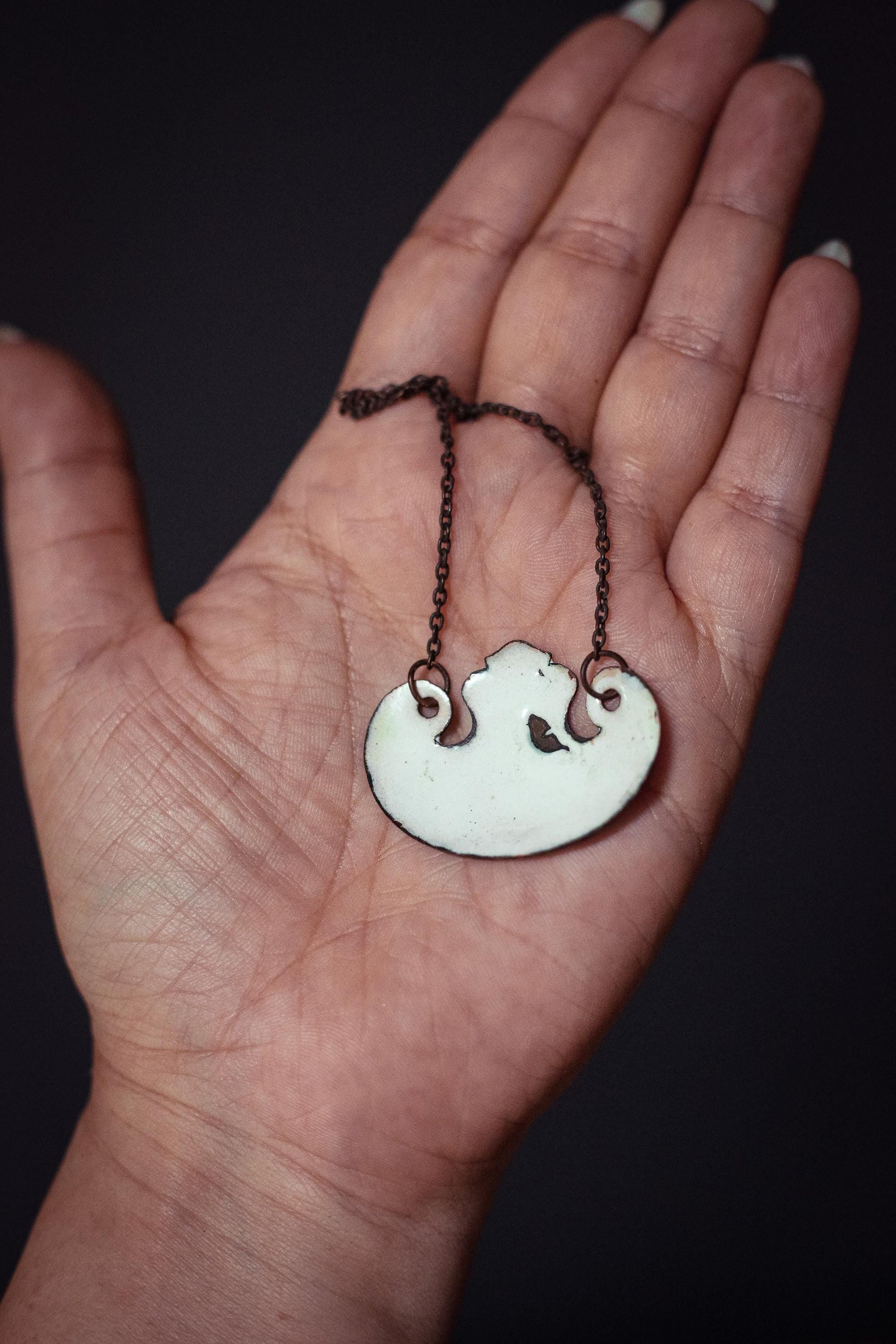 Hand painted enameled metal liquor tag. Metal chain and foundation with white enamel on both sides. Style appears to be typical of pieces produced in Englad cerca early 1900's