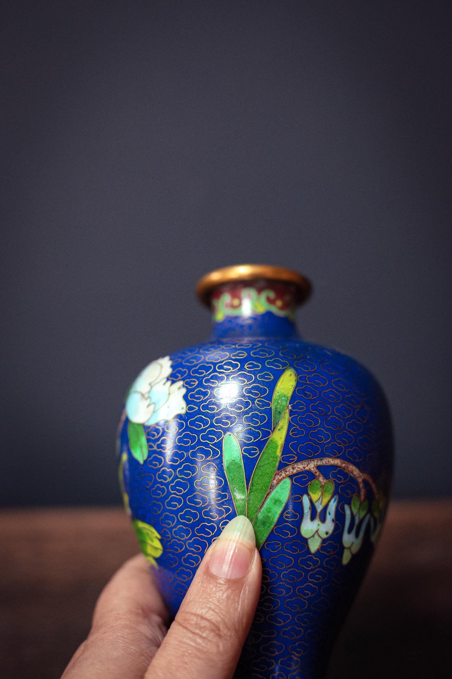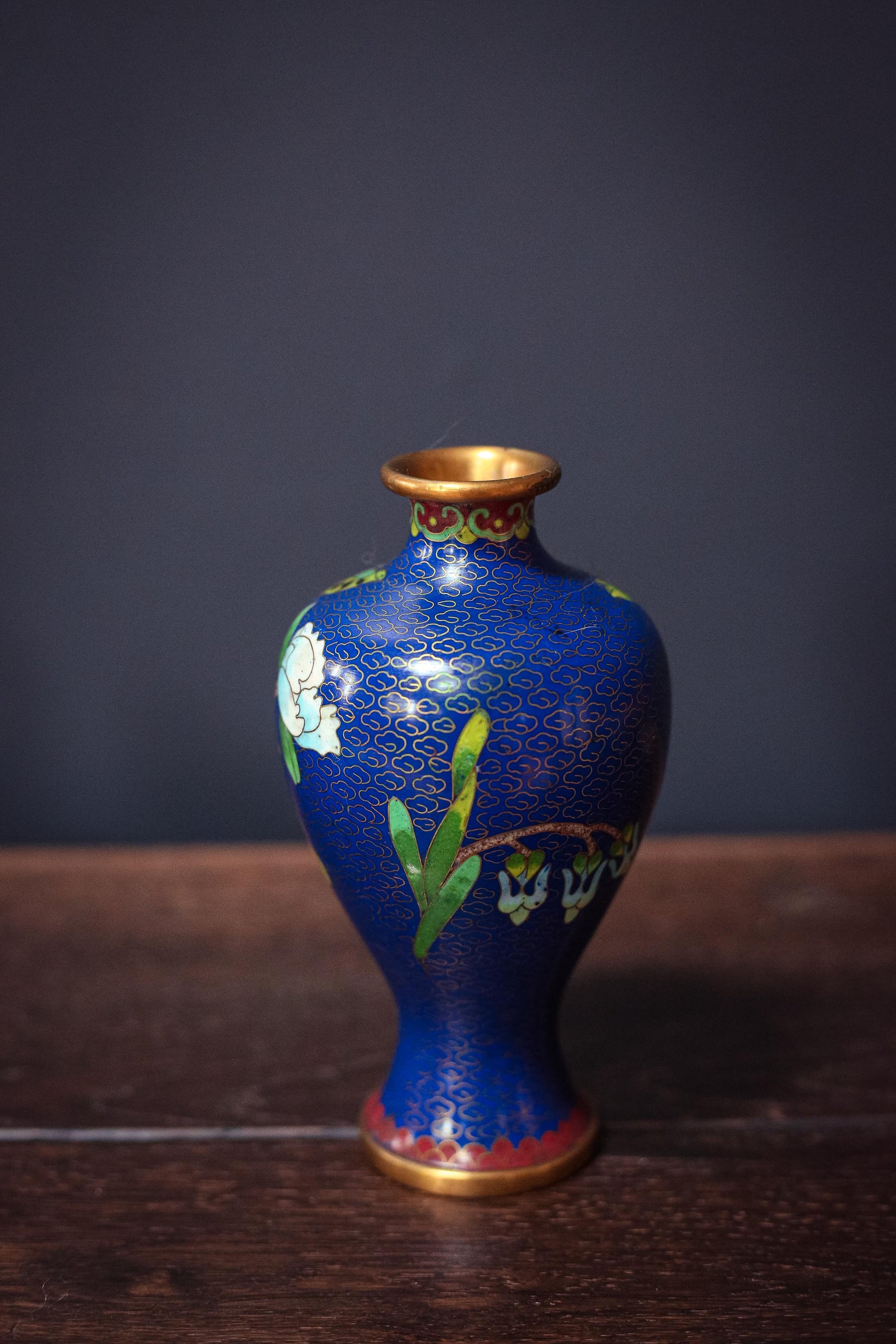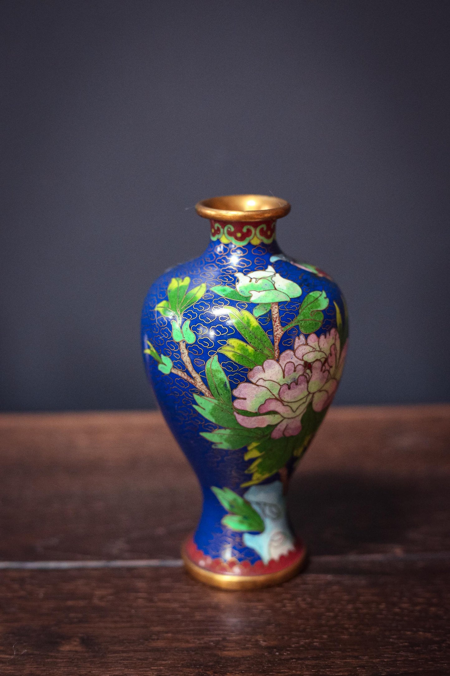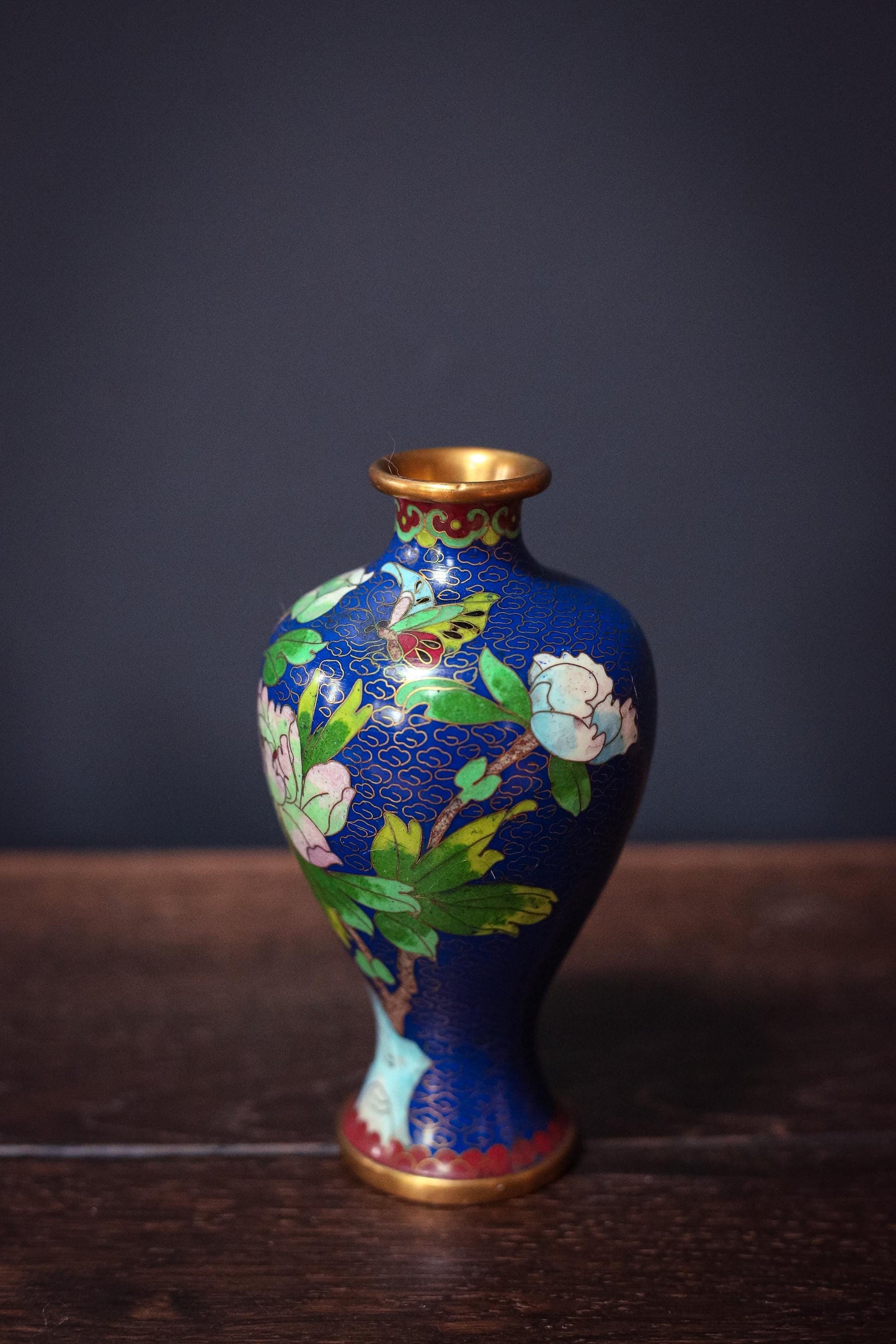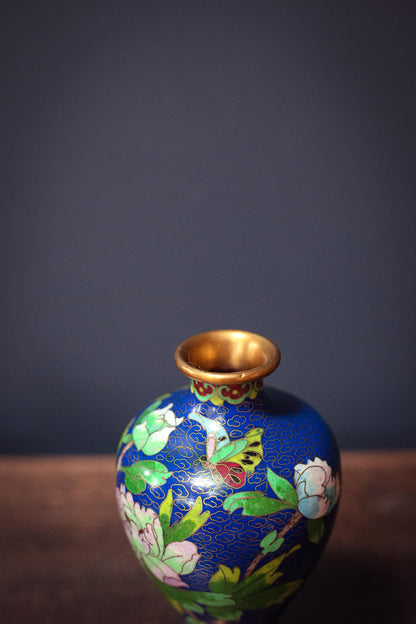 Blue Floral Cloisonne 6" Vase - Vintage Chinese Brass Enamel Vase
