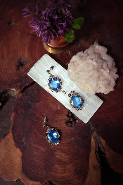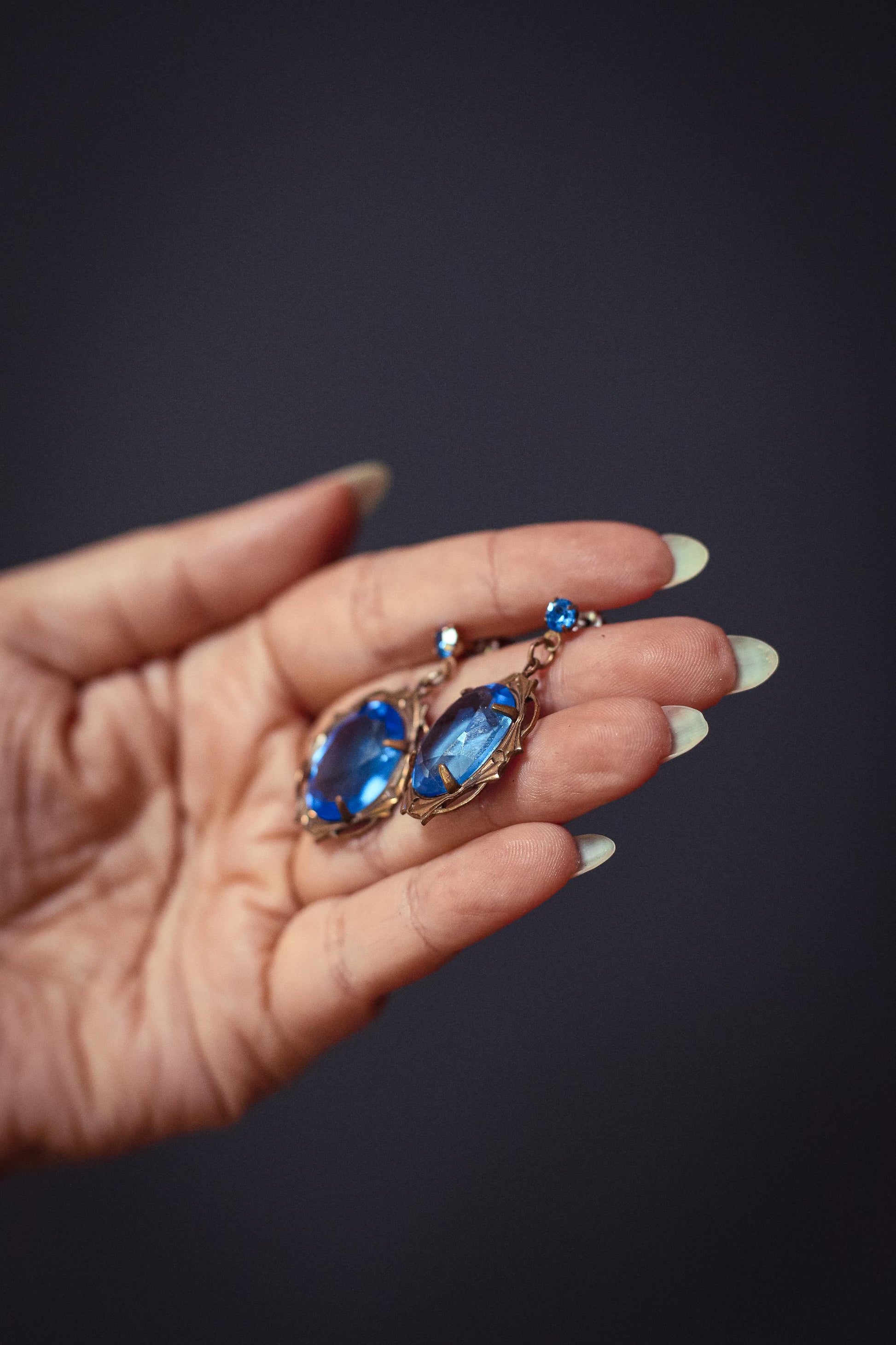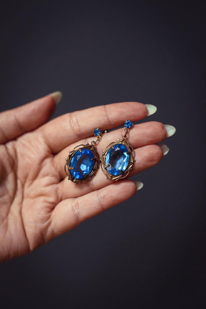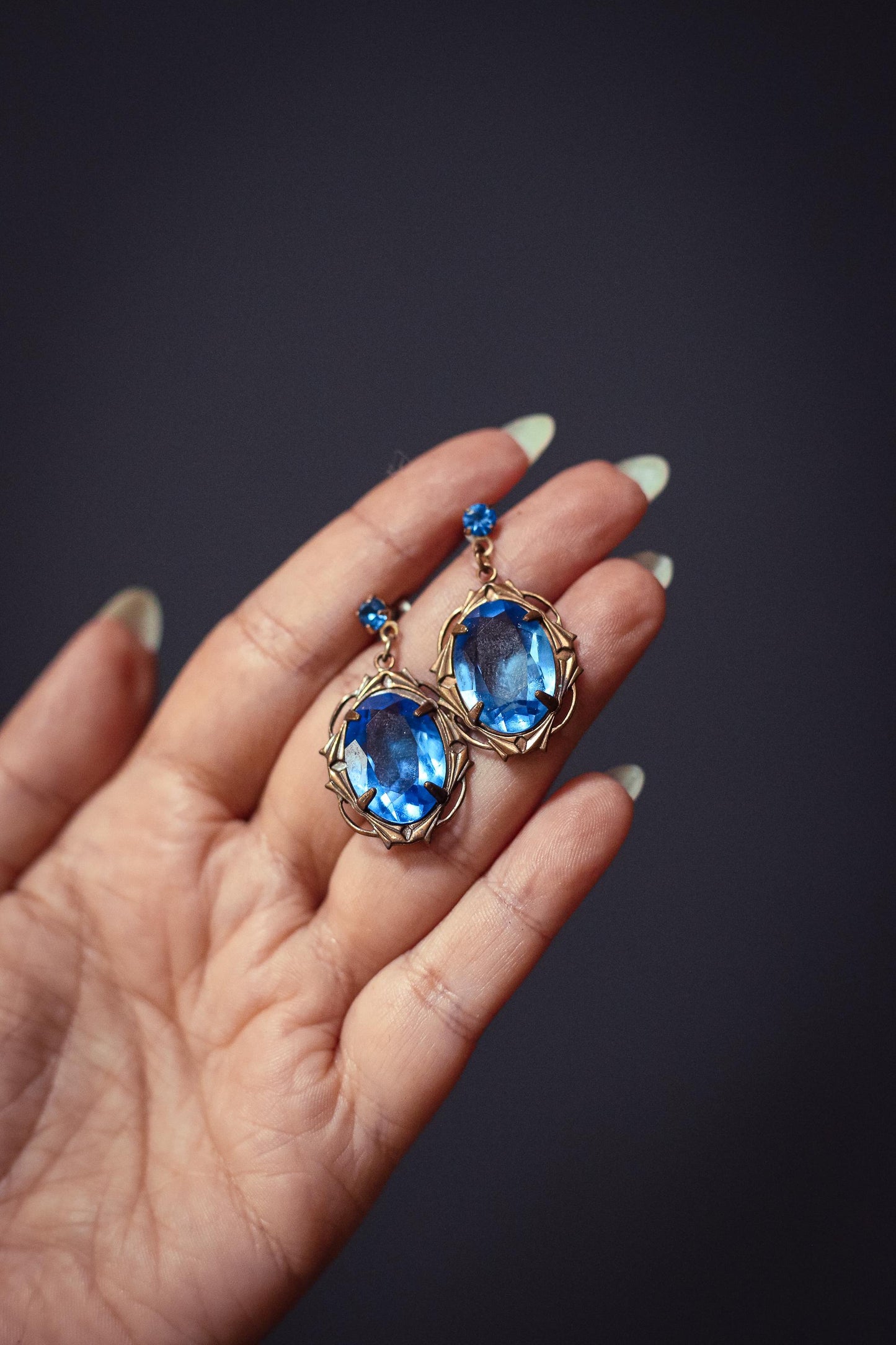 Blue Oval Crystal and Brass Filigree Drop Earrings - Vintage Crystal Earrings Estate Jewelry