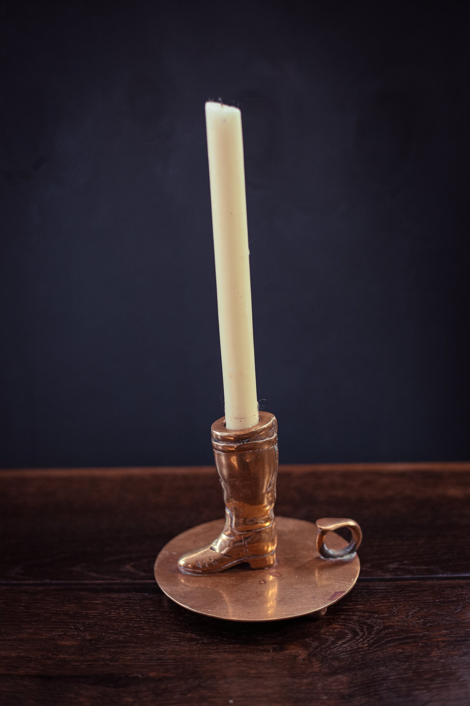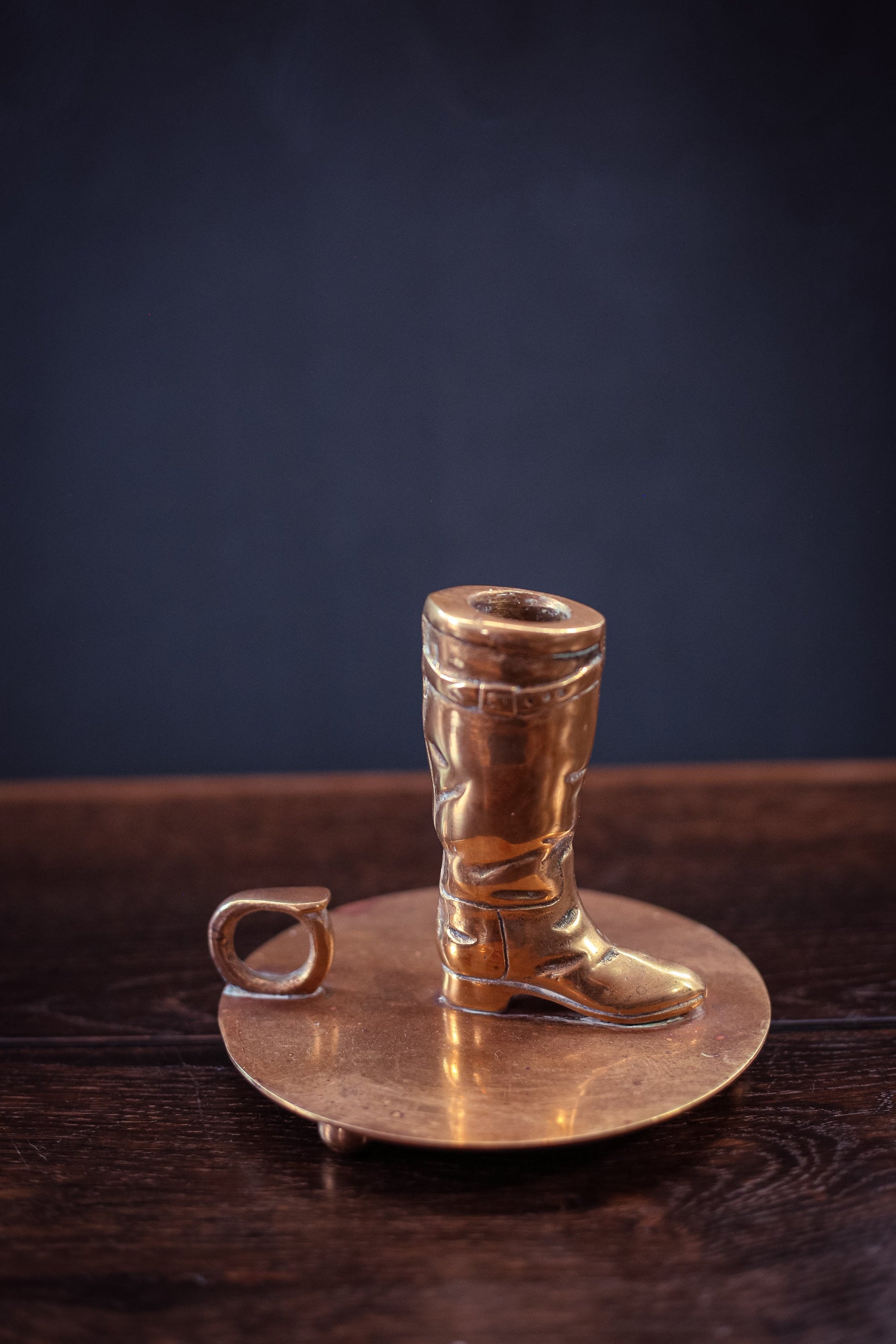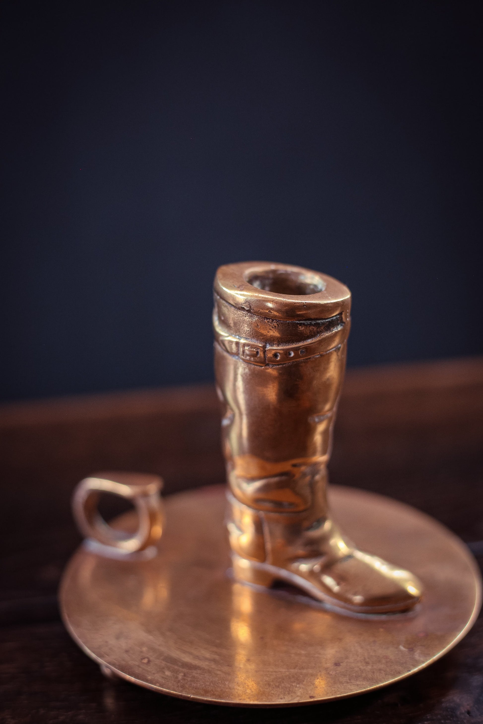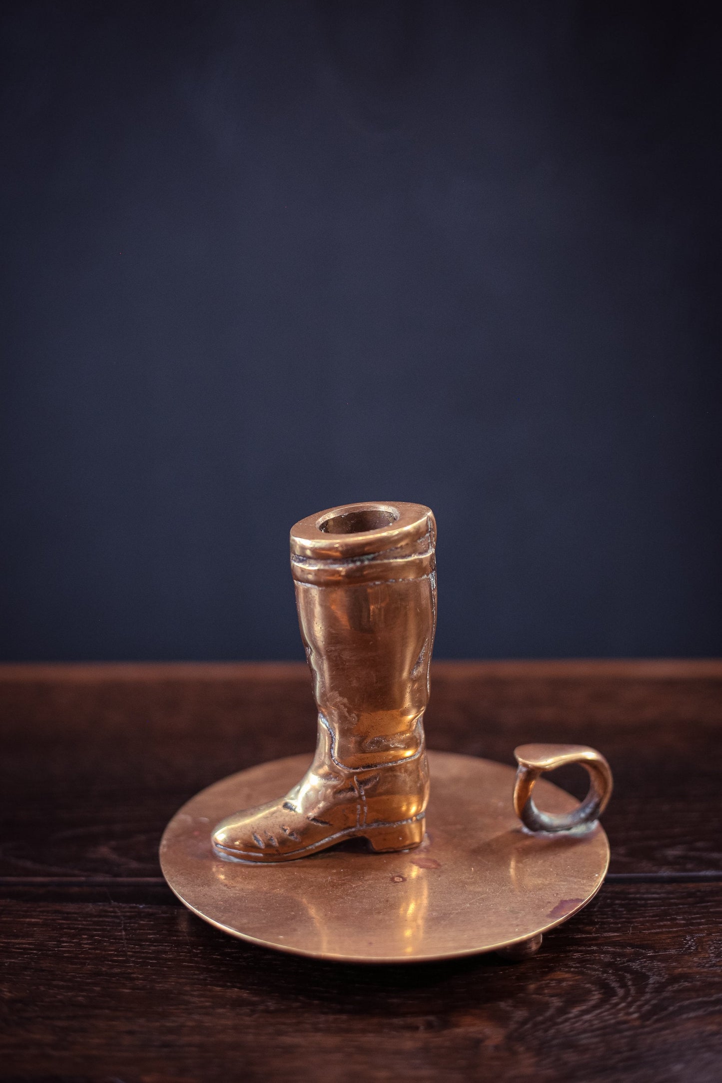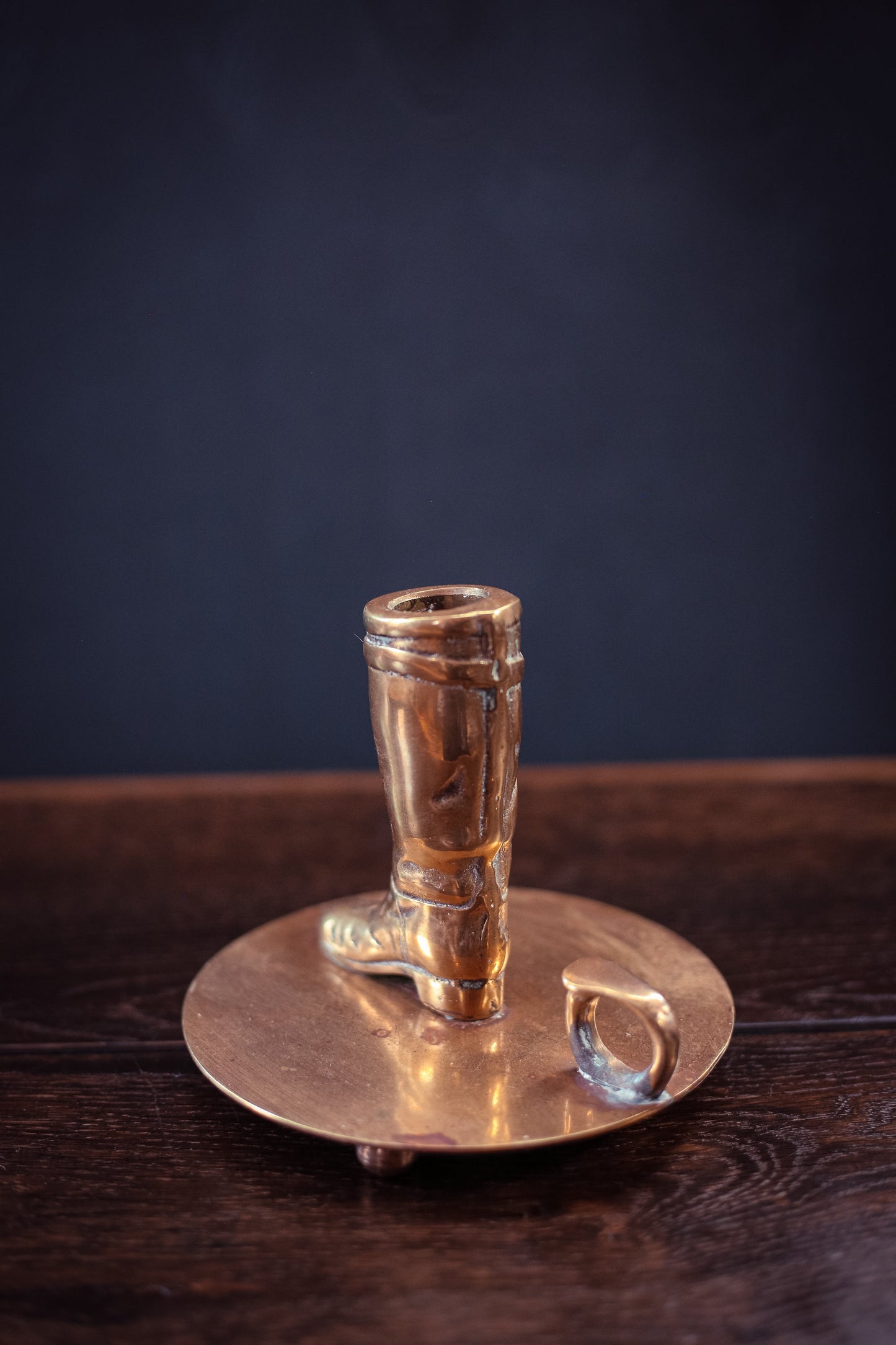 Such a unique and fun find! Vintage brass boot candle holder with handle. A funky piece of decor to decorate a one of a kind space.