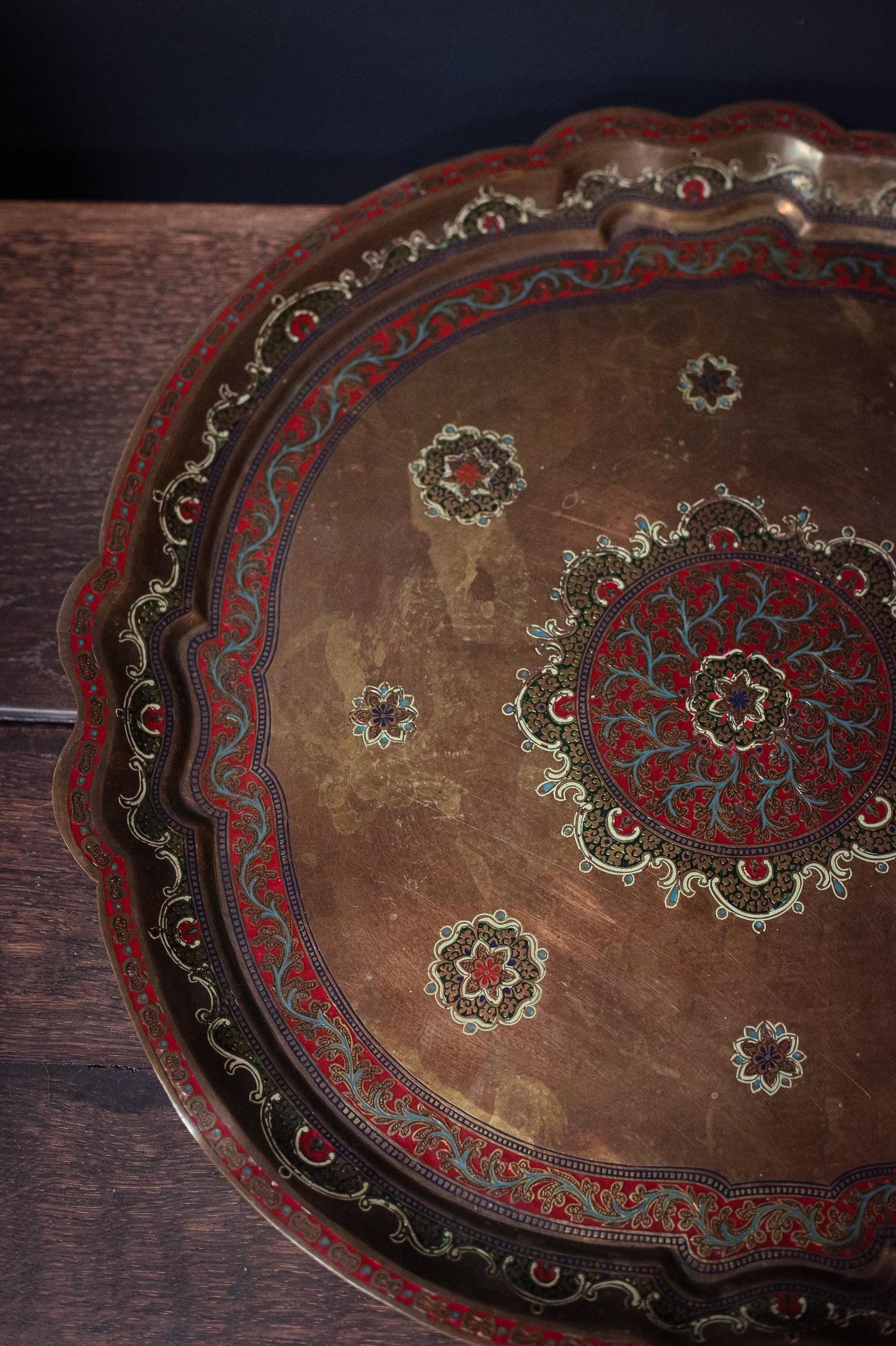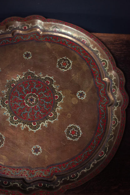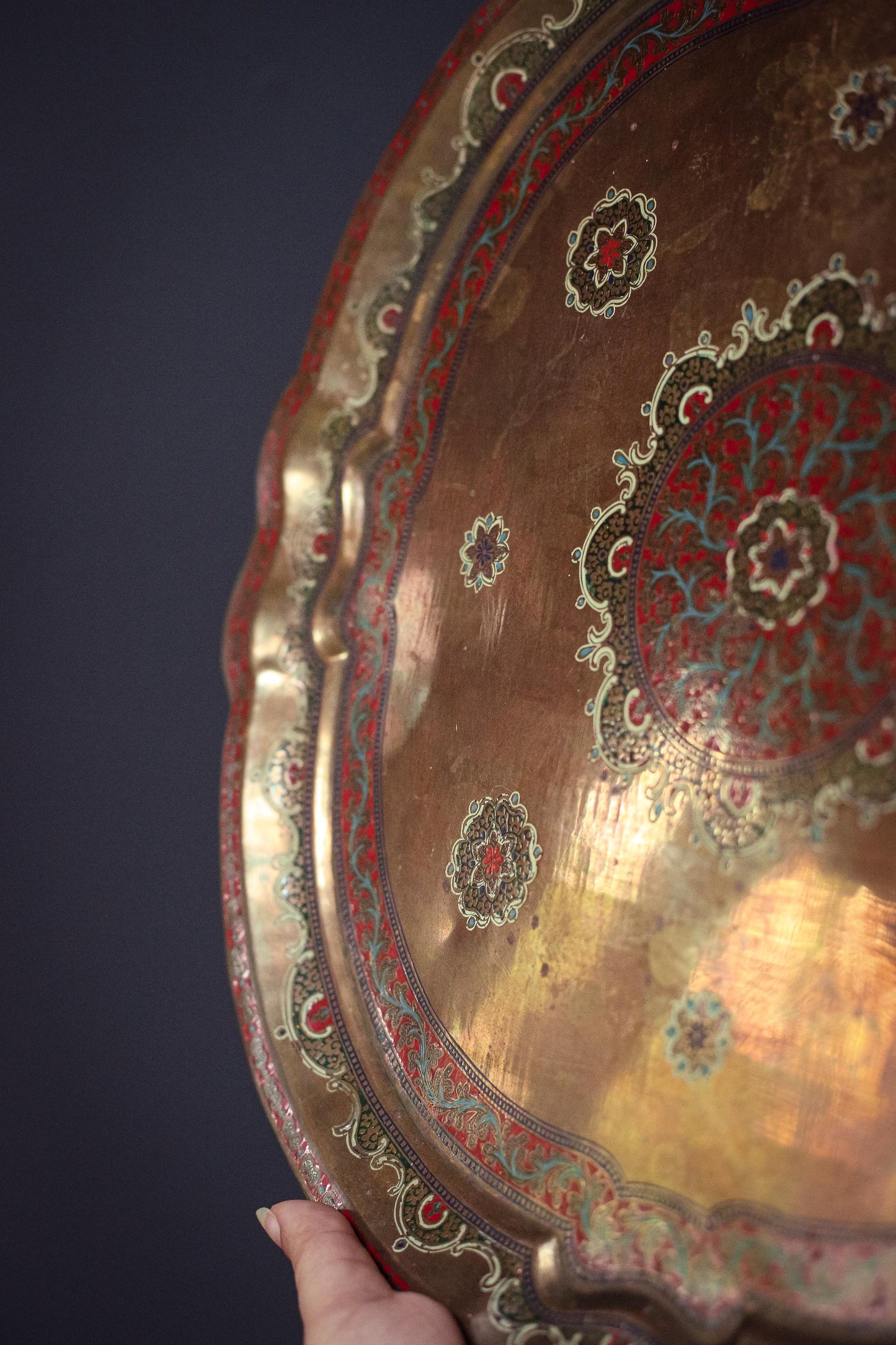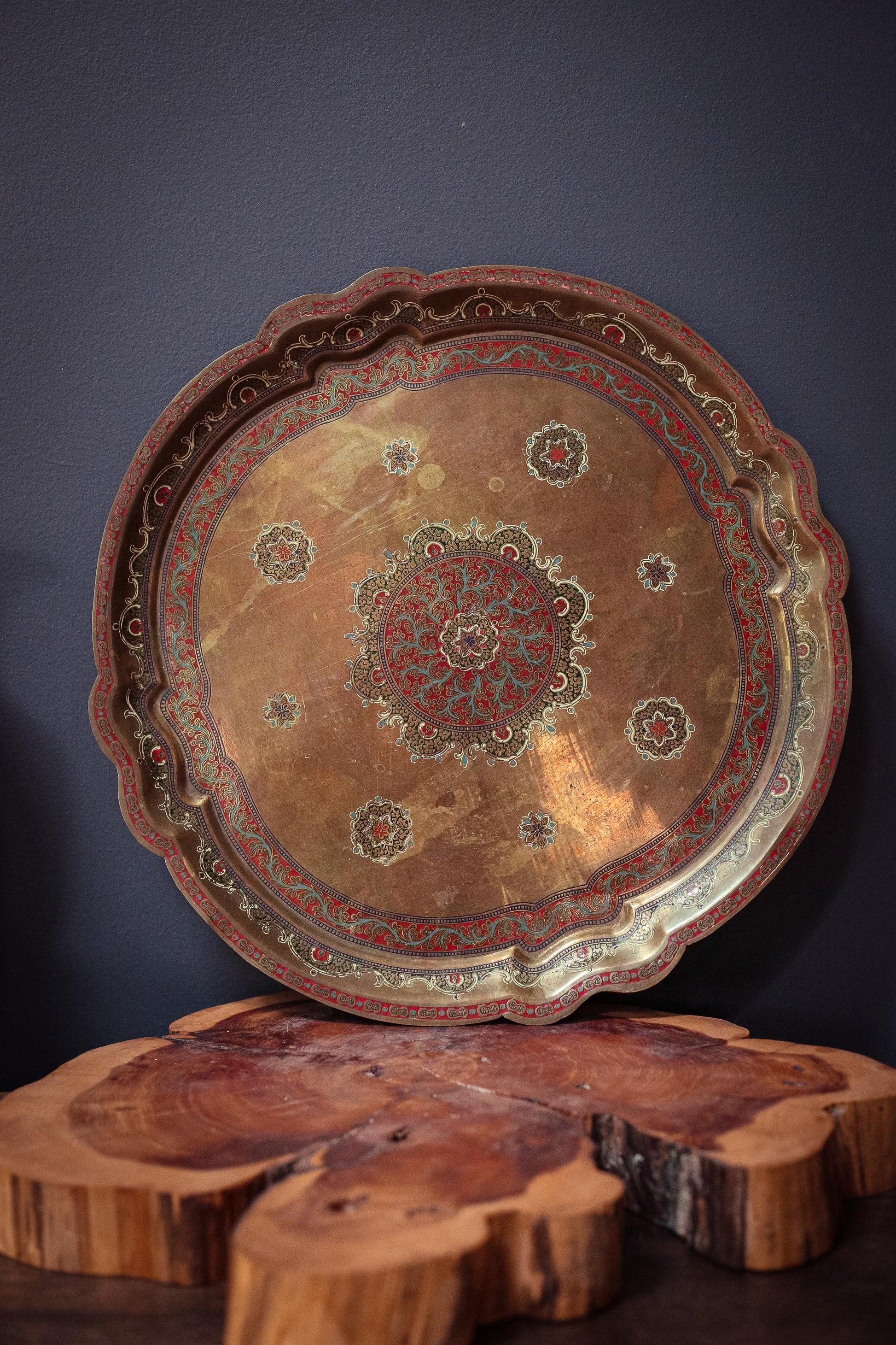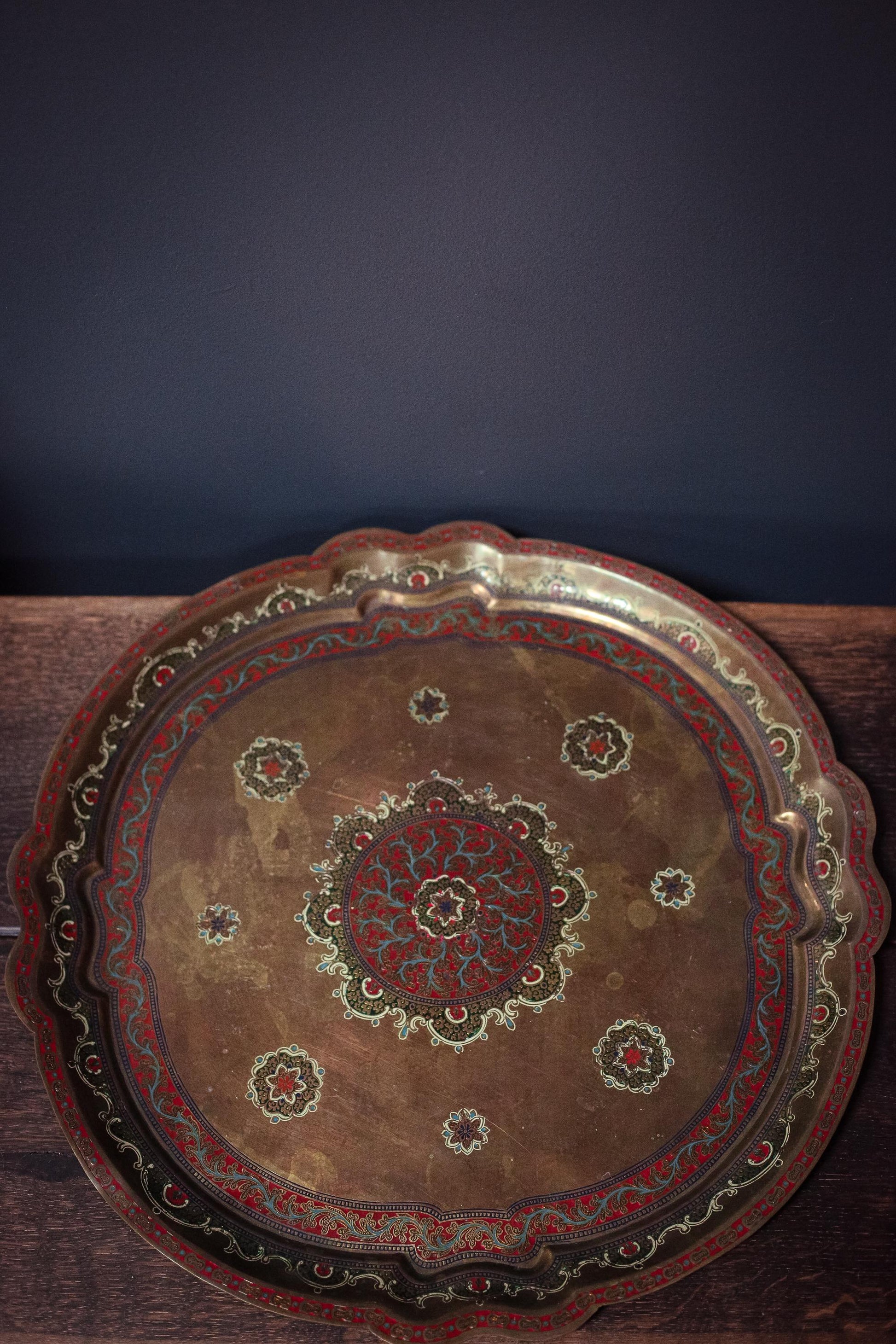 Beautiful brass tray with colorful enamel filled engravings/carved areas.