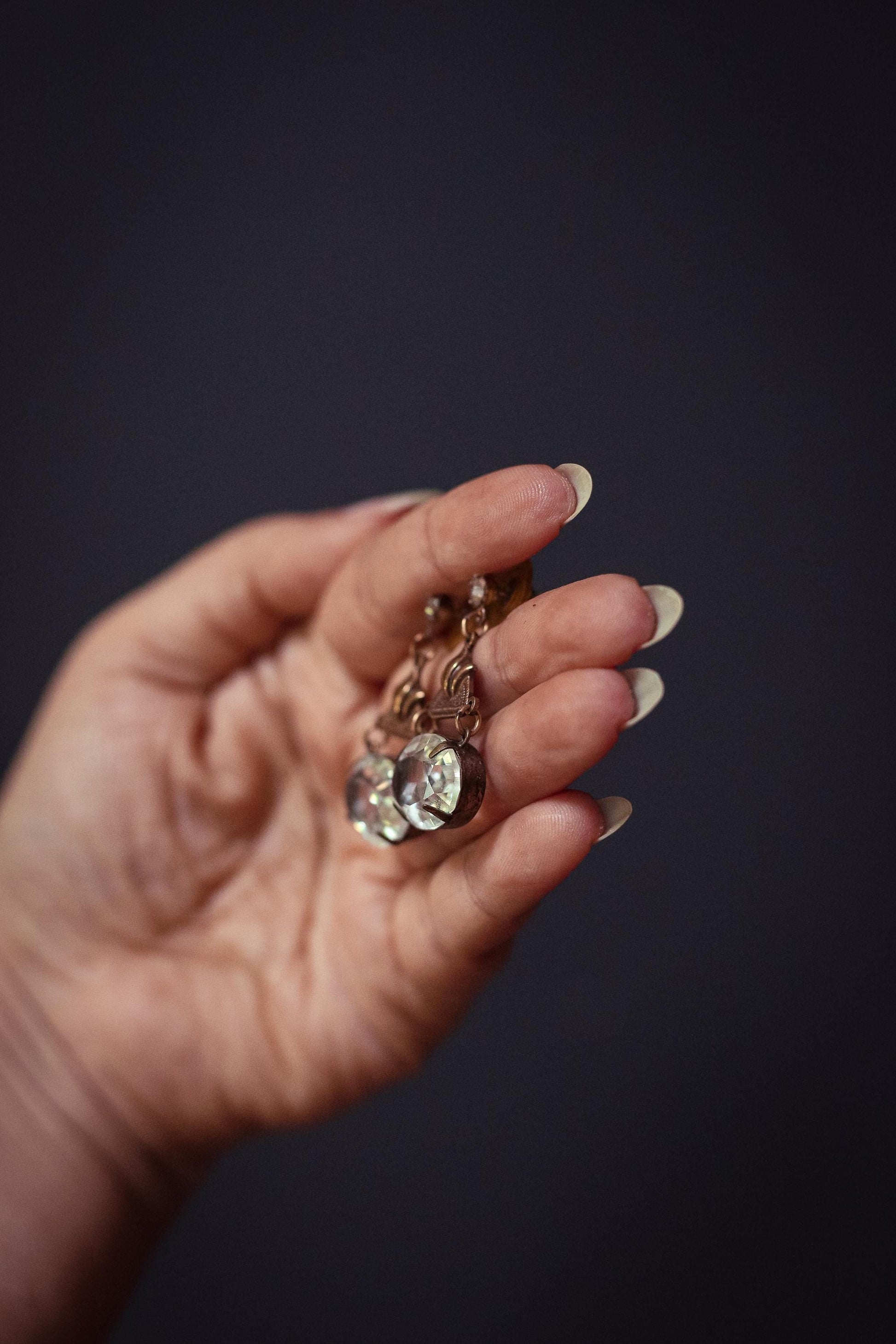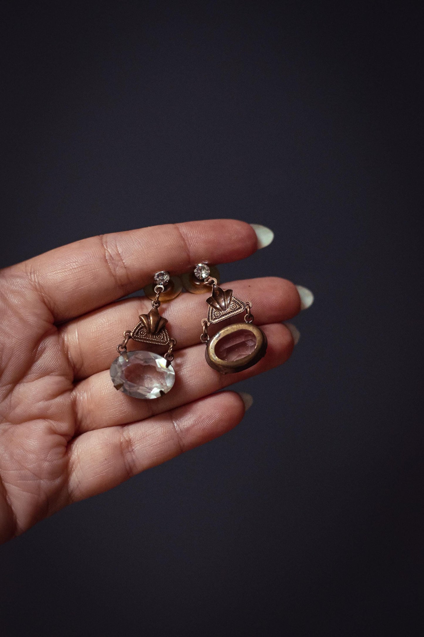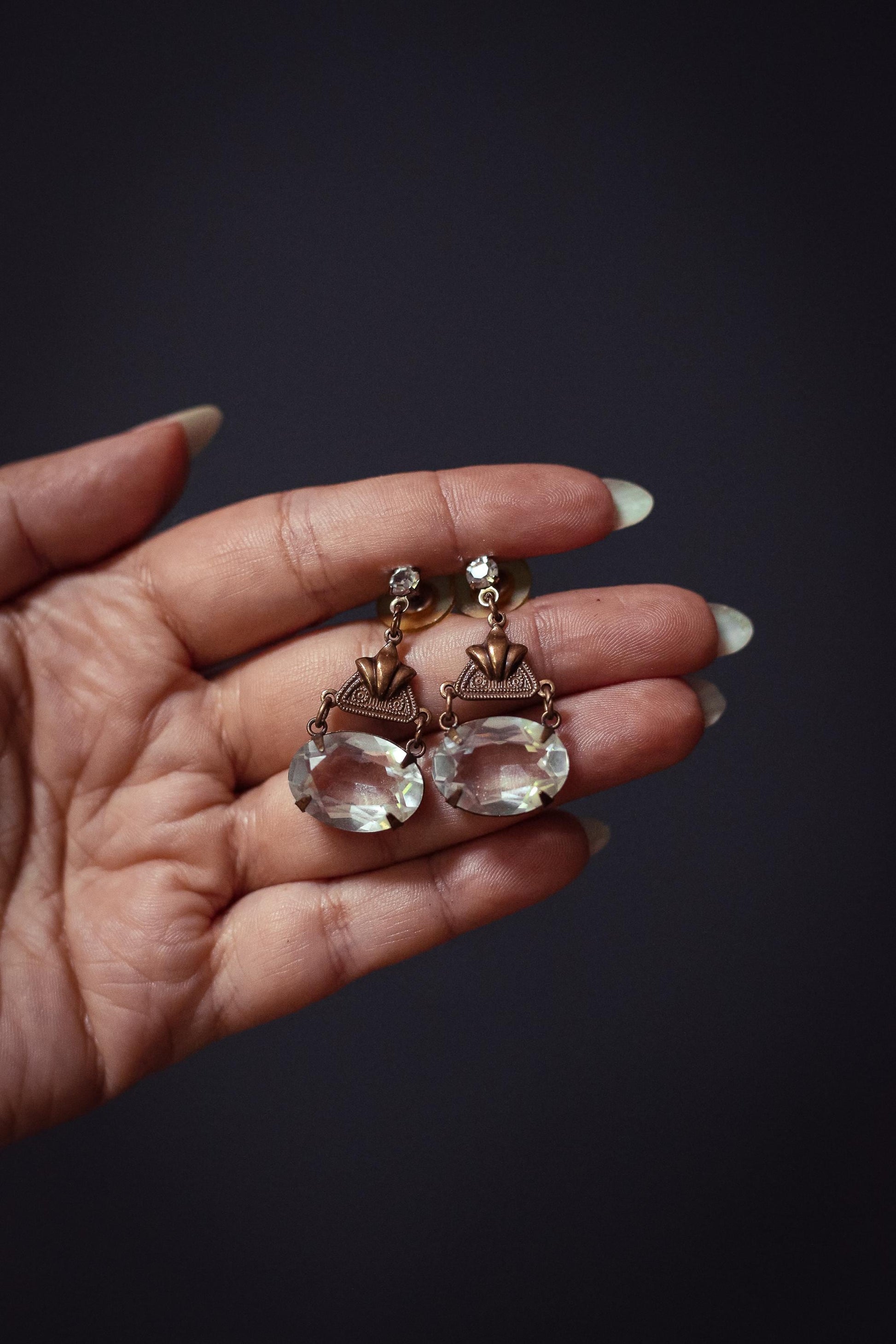 Clear Oval Crystal and Brass Filigree Dangle Drop Earring - Vintage Crystal Earrings Estate Jewelry